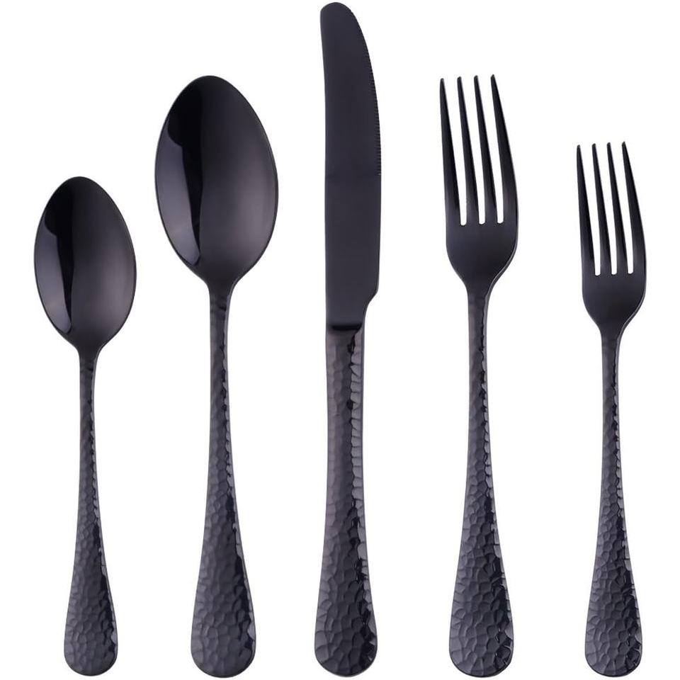 ชุดช้อนส้อมมีดสแตนเลสสีดำดีไซน์แบบทุบชุดเครื่องใช้บนโต๊ะอาหารหรูหราทนทานและปลอดภัยใช้กับเครื่องล้างจานเหล็กมิเรอร์