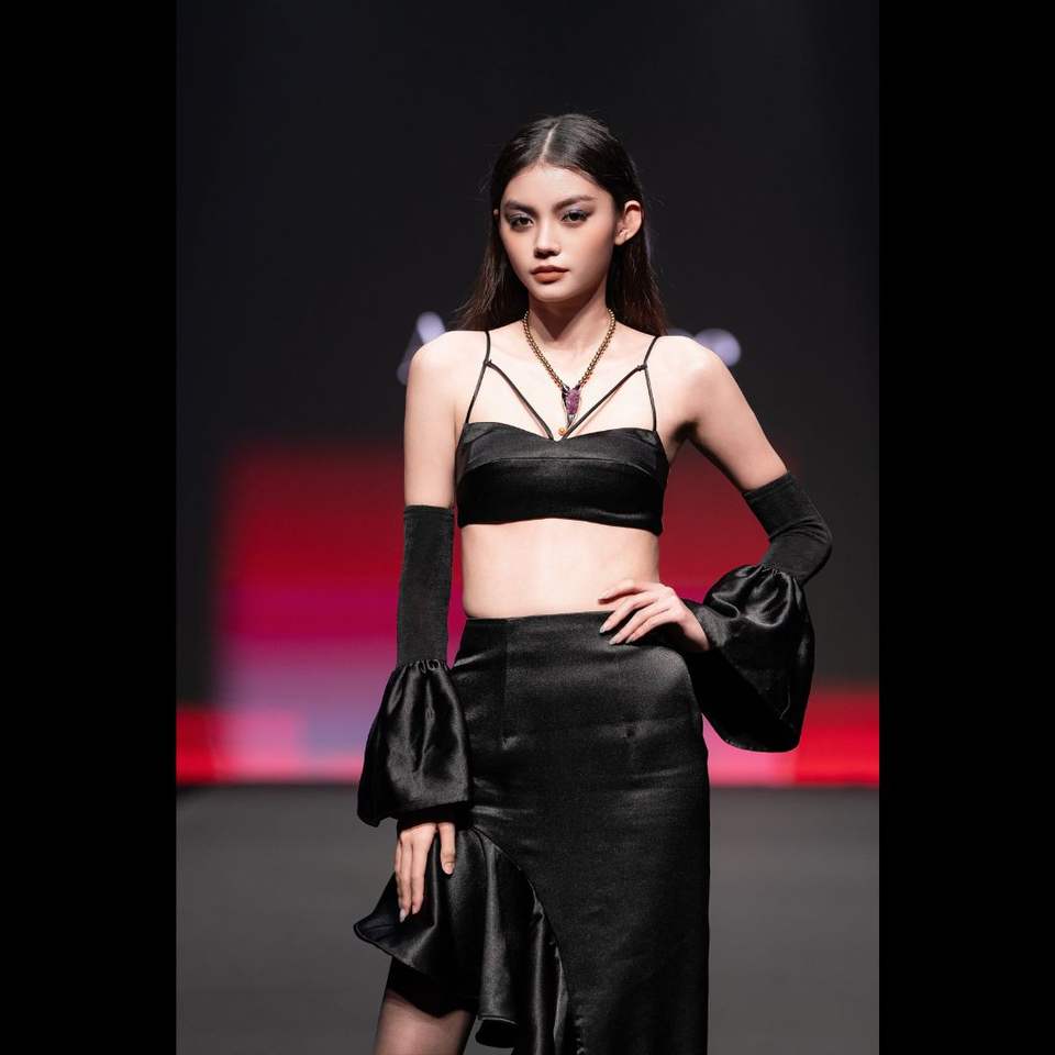 คำอธิบาย:กระโปรงมิดิทรงไม่สมมาตรแต่งระบาย