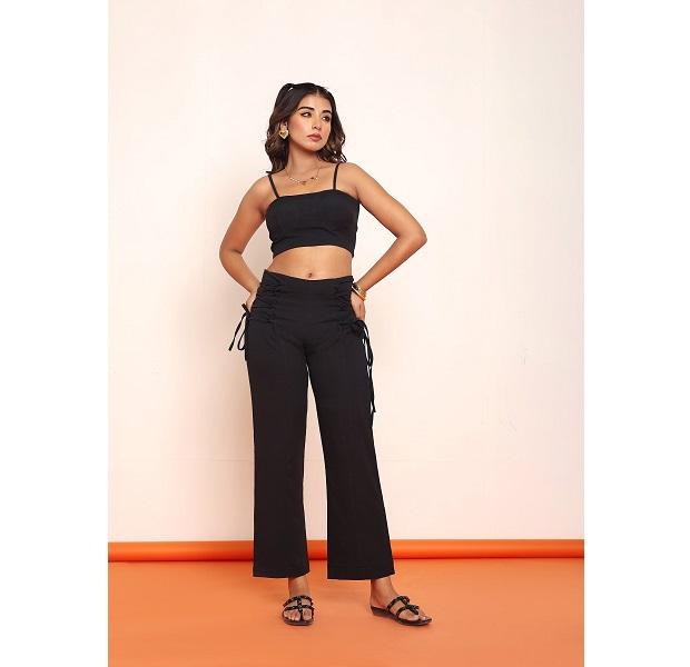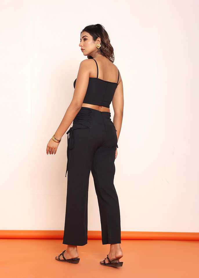 ชุดเซ็ตทูพีซสำหรับผู้หญิง เสื้อครอปสีดำรัดเชือกพร้อมกางเกงขายาวทรงตรง ดีไซน์ทันสมัย กระชับรูปร่าง ดูมีสไตล์