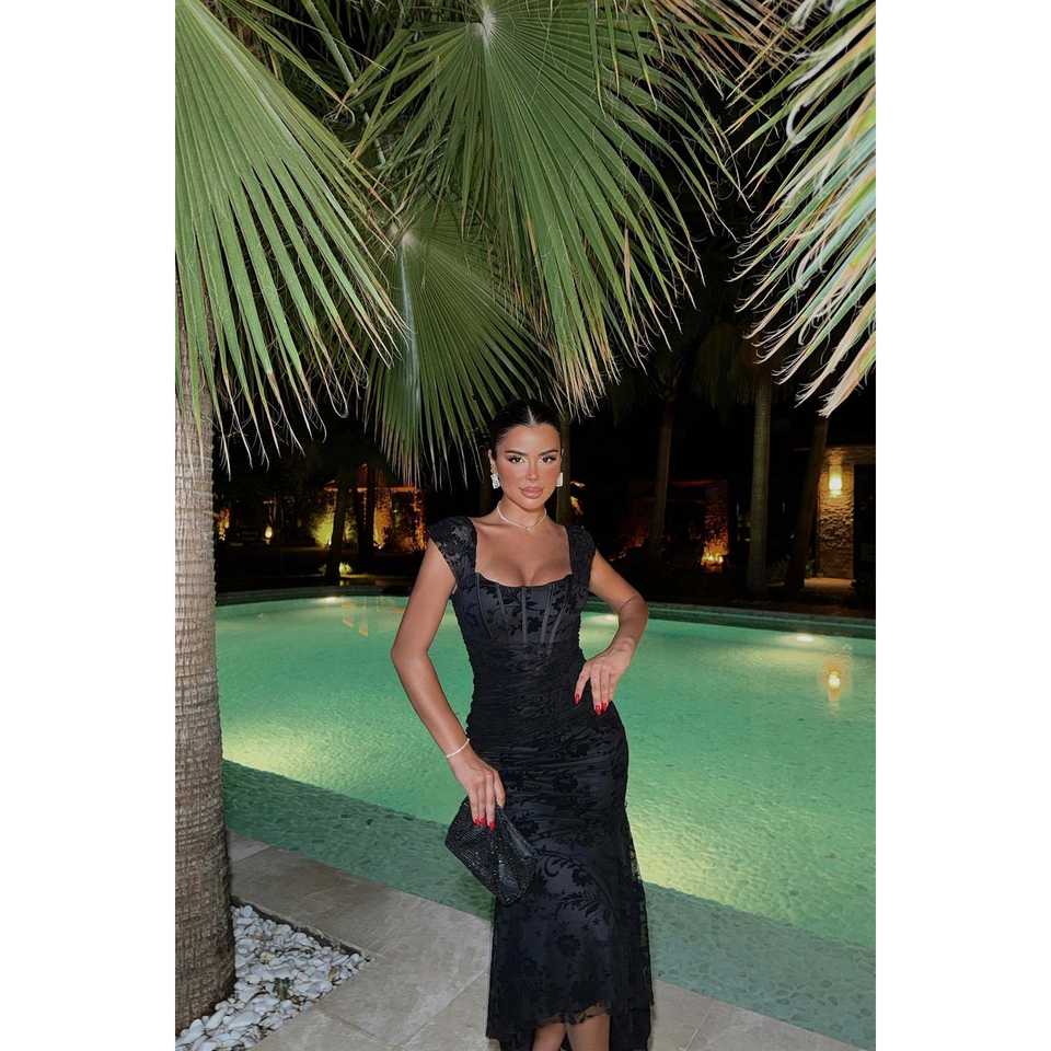 ชุดเดรสคอร์เซ็ตสีดำ ผ้าโพลีเอสเตอร์ ทรงบอลกาวน์ยาวกรอมพื้น ปักเลื่อม คอแบบผูก ไซส์ XL เอวธรรมชาติ