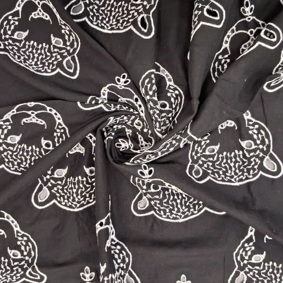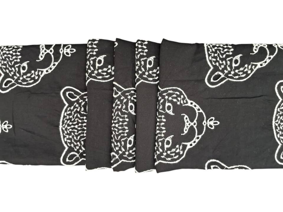 ผ้าฝ้ายสีดำปักลายหัวเสือดาวสีขาว ลายหน้าสัตว์ทั่วผืน งานปักด้ายบูติ ผ้าทอสำหรับใช้ในบ้าน น้ำหนักเบา