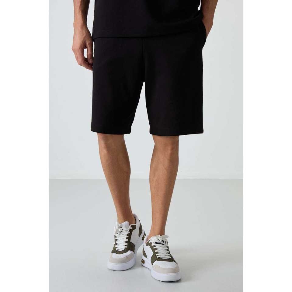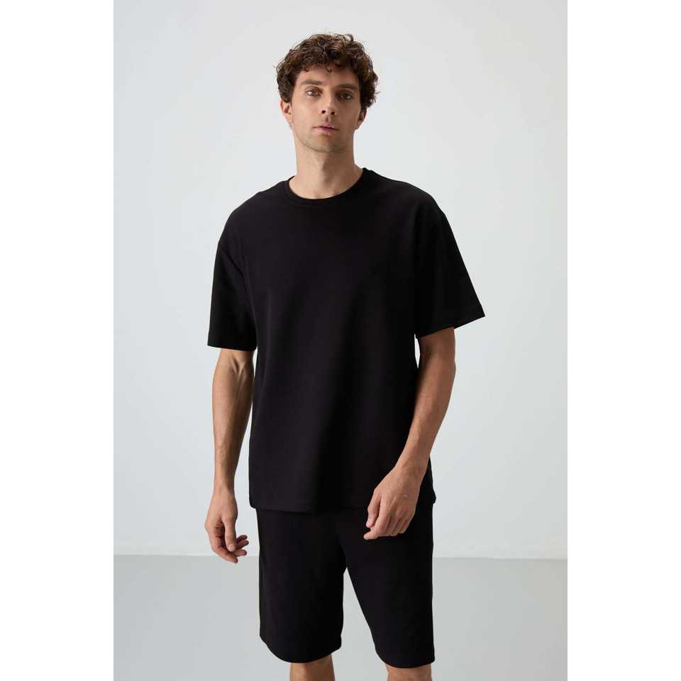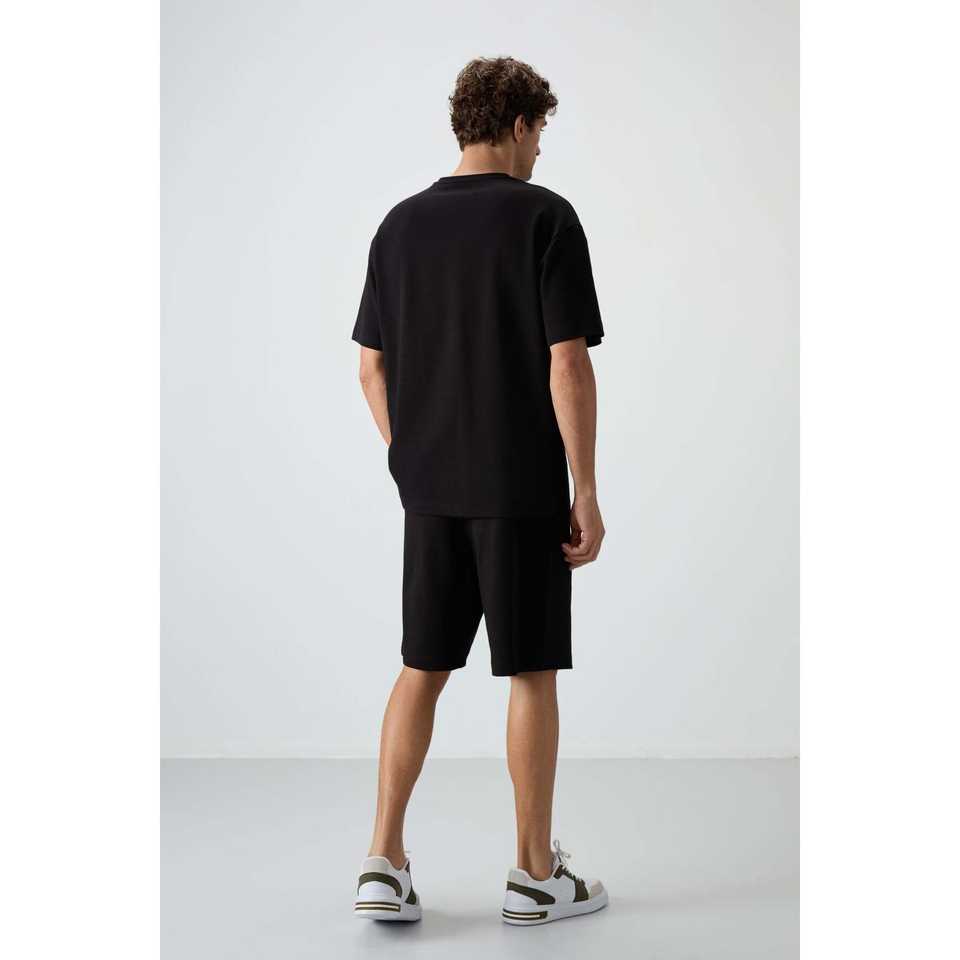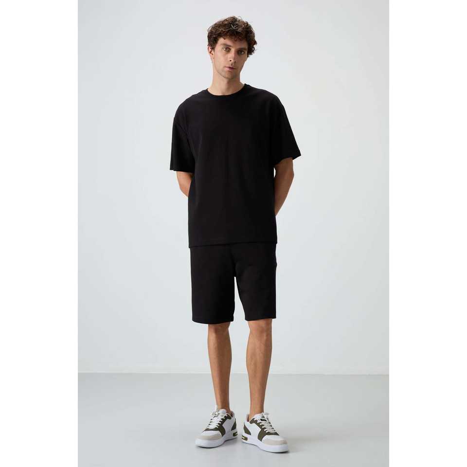 ชุดกางเกงขาสั้นผู้ชายทรงโอเวอร์ไซส์ผ้าฝ้ายสีดำ 100% ผ้าฝ้ายเนื้อพื้นฐาน รุ่น 85249