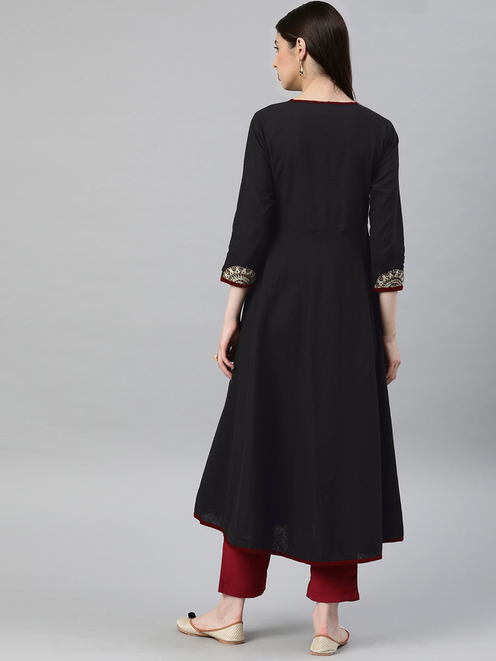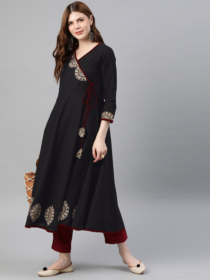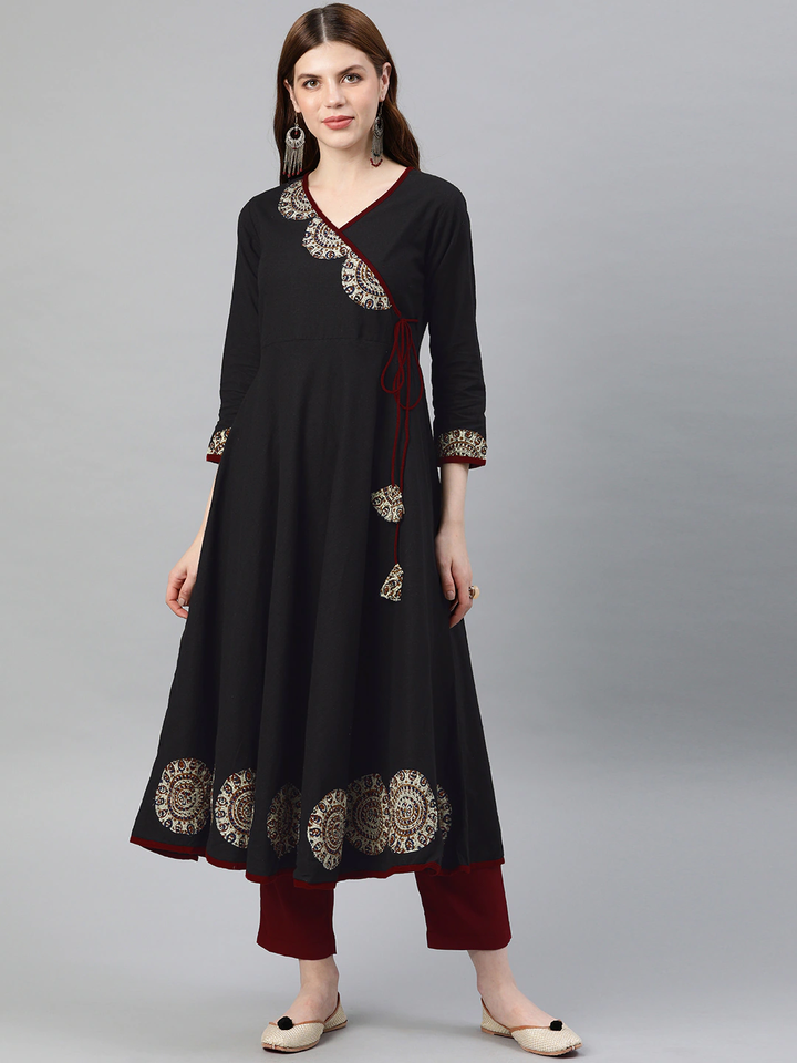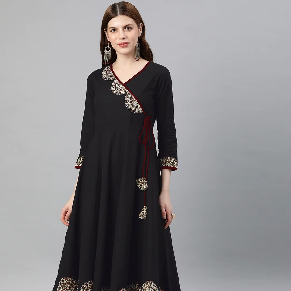 ชุดคุर्ตาผู้หญิงสไตล์อังกรากา ผ้าฝ้ายสีดำลายสลับ ตกแต่งด้วยผ้าปะติดปะต่อ คอวี แขนสามส่วน งานฝีมือสไตล์ชาติพันธุ์ทั่วโลก แฟชั่นลำลอง