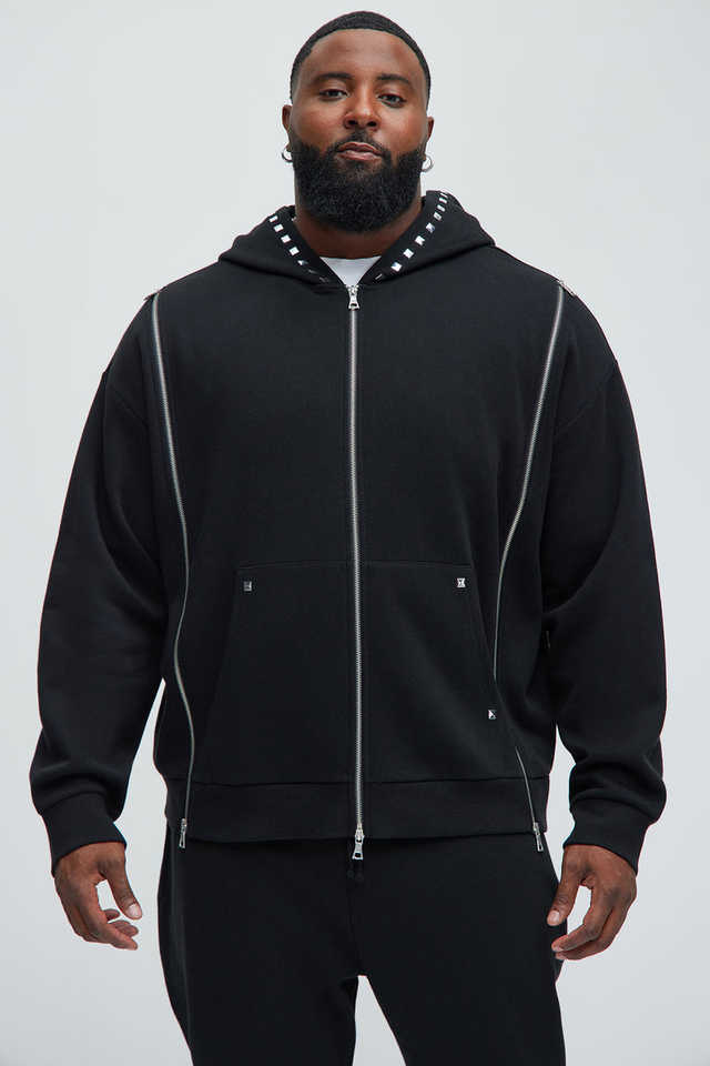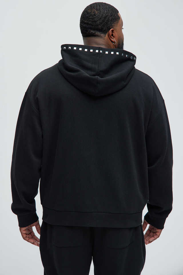 เสื้อฮู้ดดี้ทรงบ็อกซี่สีดำแบบสั่งทำพิเศษ ตกแต่งด้วยหมุดโลหะ ซิปโลหะ แขนยาว ผ้าคอตตอนผสม สำหรับผู้ชาย โดย Ako
