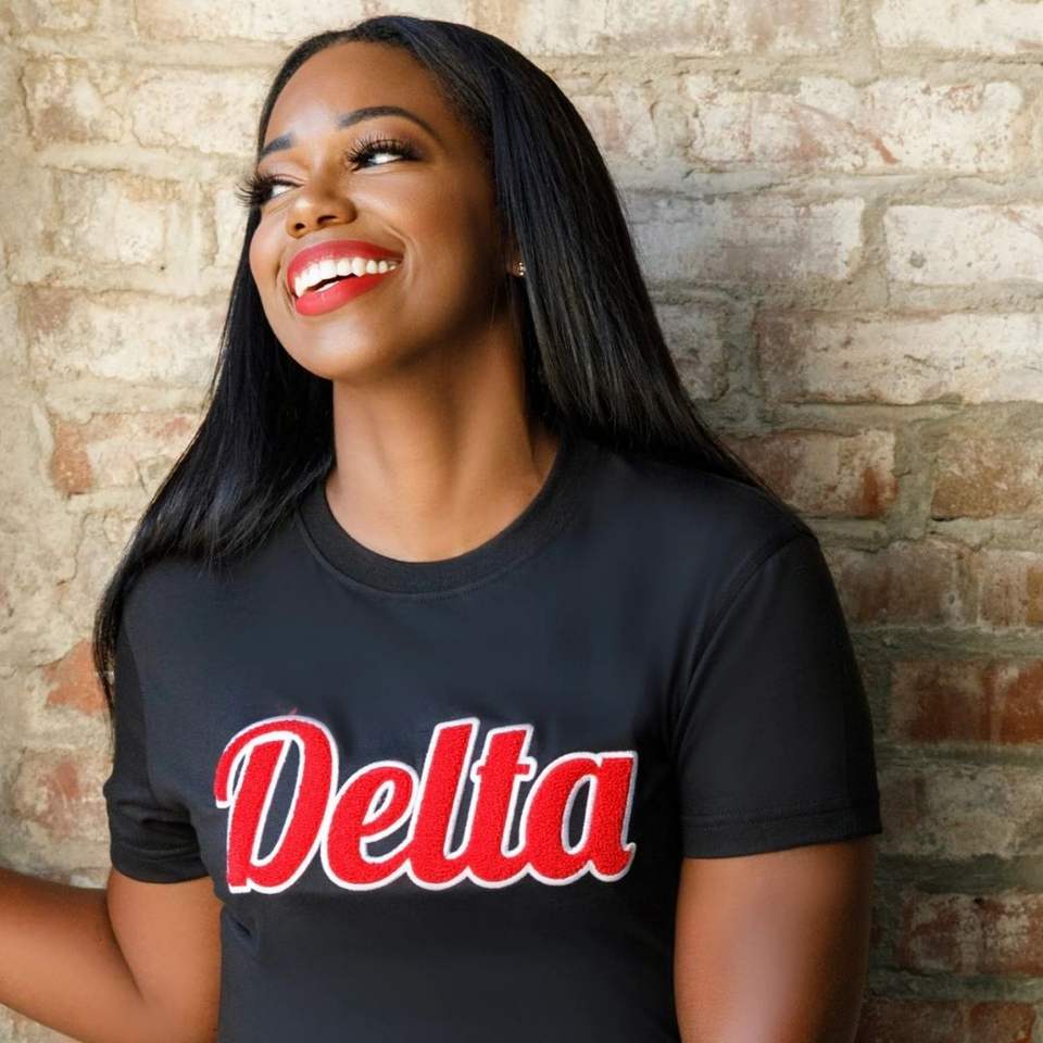 เสื้อยืดปักลายเดลต้ากำมะหยี่สีดำเสื้อผ้าสำหรับสโมสรผ้าฝ้ายระดับพรีเมียมเสื้อยืดลำลองมีตัวอักษรสีแดง