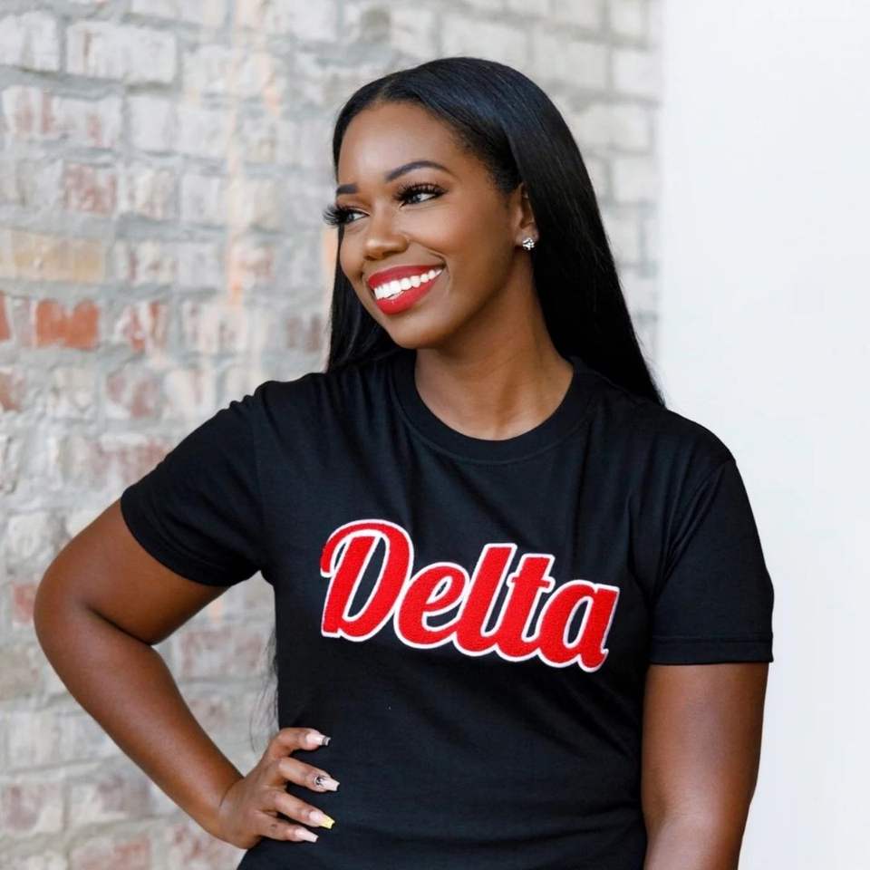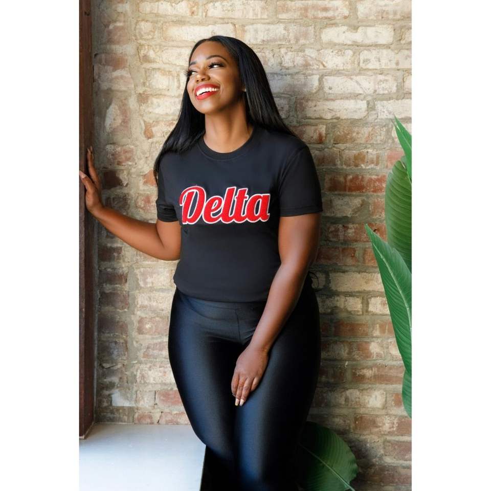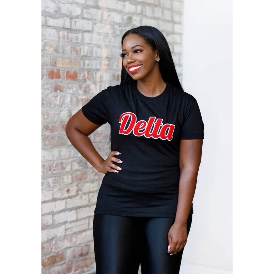 เสื้อยืดปักลายเดลต้ากำมะหยี่สีดำเสื้อผ้าสำหรับสโมสรผ้าฝ้ายระดับพรีเมียมเสื้อยืดลำลองมีตัวอักษรสีแดง