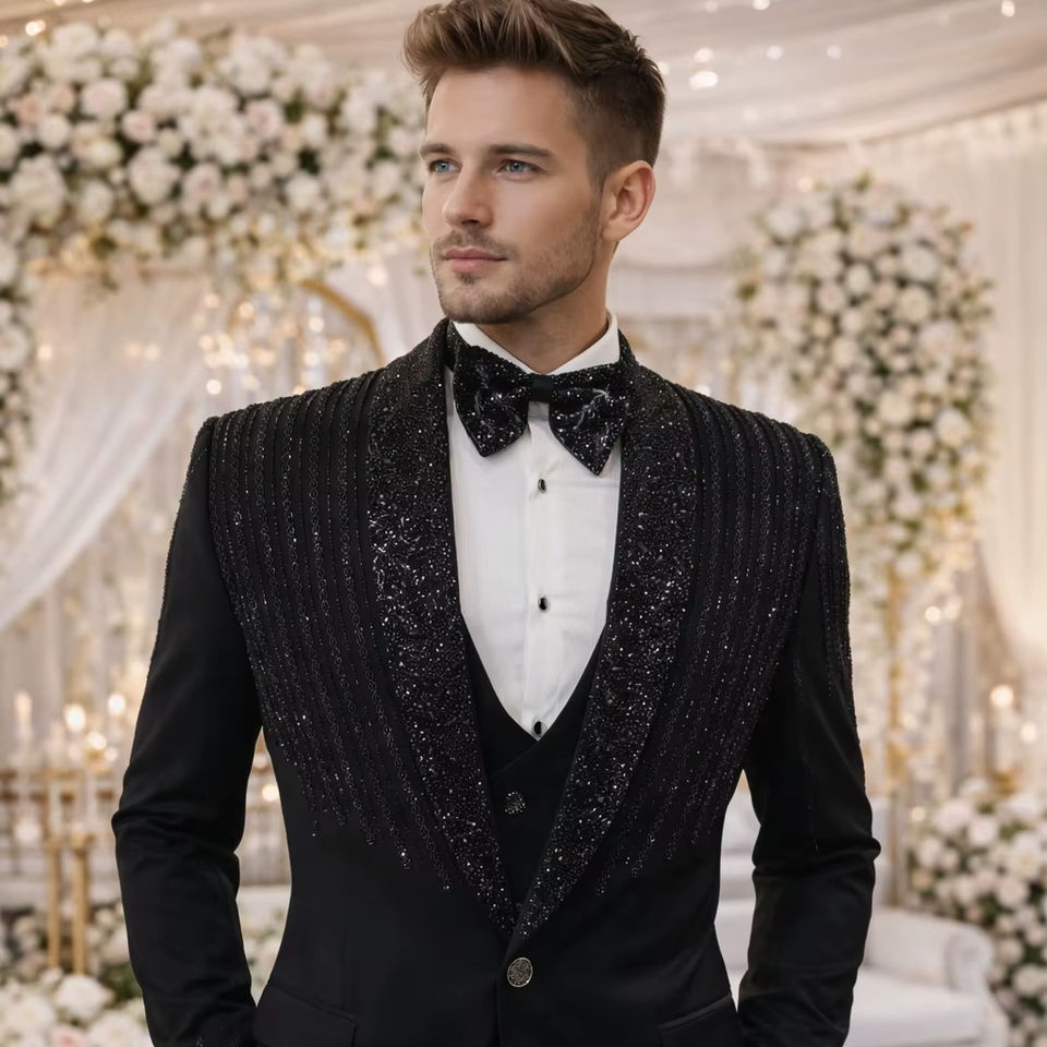 ชุดทักซิโด้สีดำปักมือดีไซเนอร์, เสื้อแจ็คเก็ตเจ้าบ่าวสีดำแบบดั้งเดิม, เสื้อแจ็คเก็ตงานแต่งงานแบบอินเดีย ชุดสูทผู้ชาย