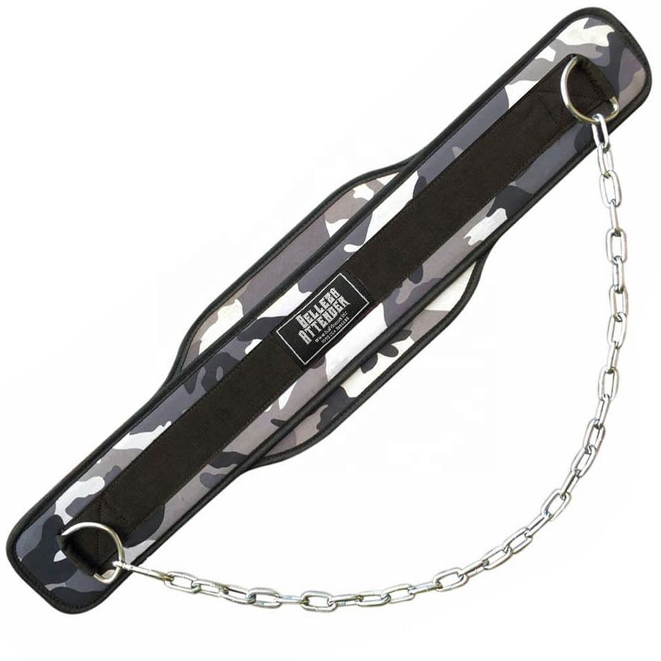 เข็มขัดจุ่มยางสีดำพร้อมคลิปโซ่2อันสำหรับยกน้ำหนักการฝึกเพาะกายดีไซน์ลายพราง