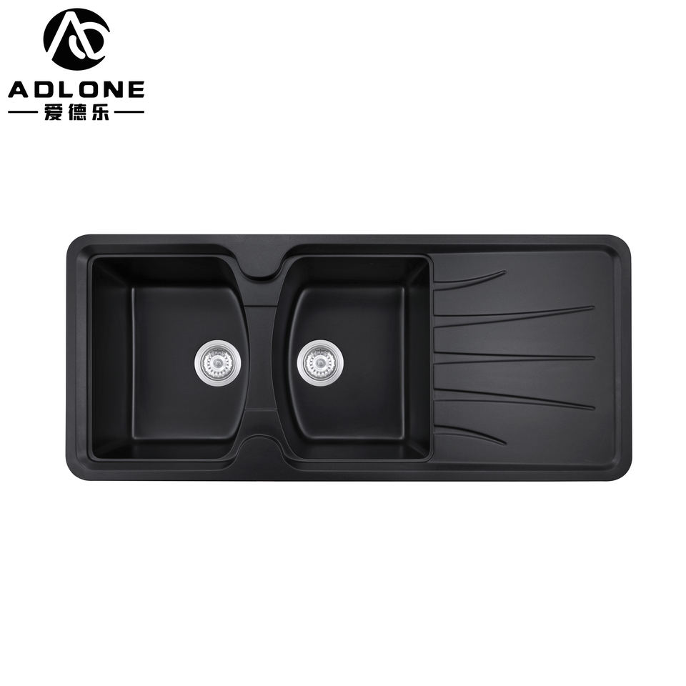 อ่างล้างจานควอตซ์สีคู่สีดำอ่างล้างจานหินแกรนิตพร้อมที่ระบายน้ำ