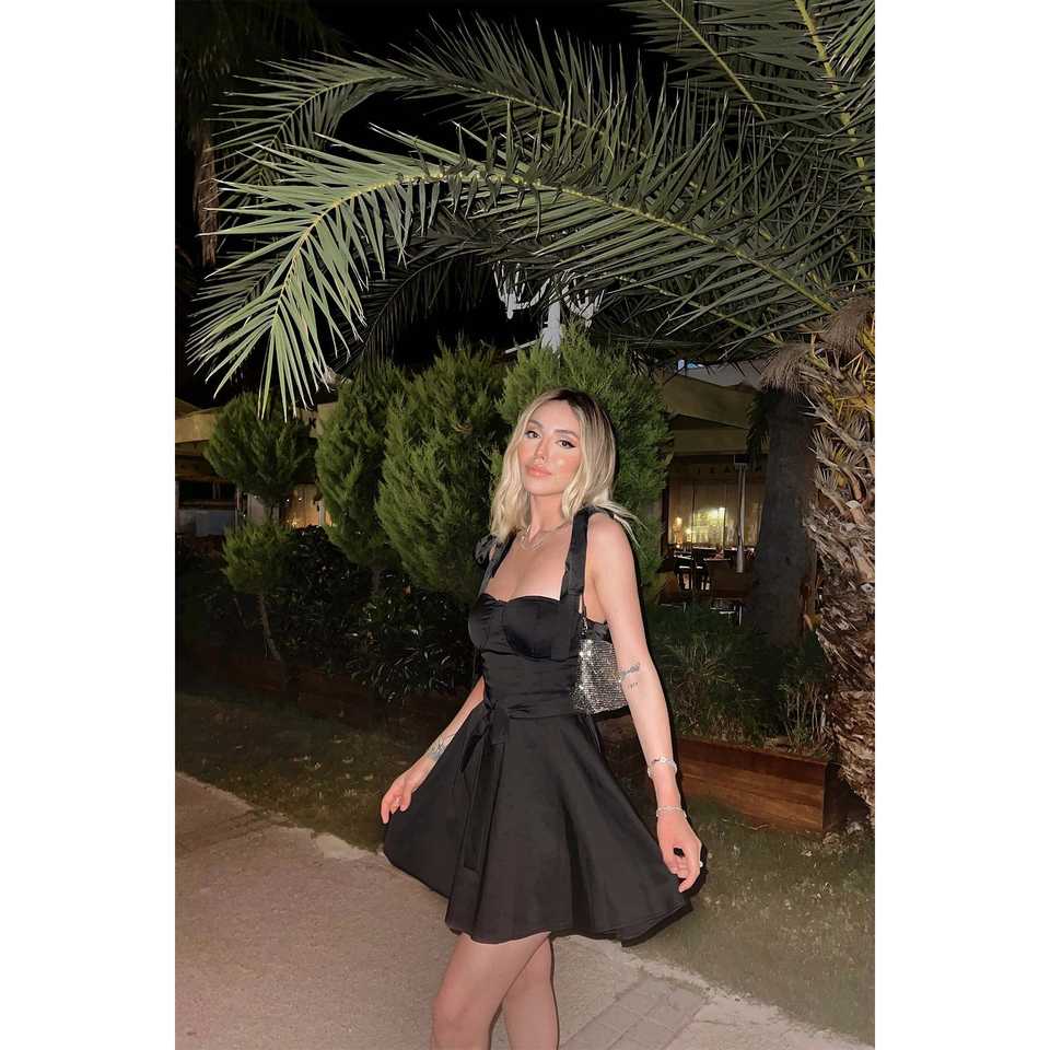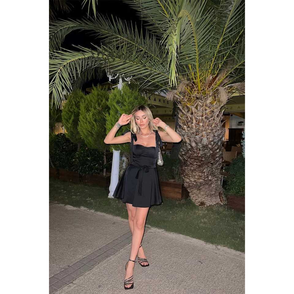 ชุดเดรสผ้าซาตินสีดำ ทรงเอไลน์ โครเชต์ แต่งเอวทรงเอ็มไพร์ แขนสั้น ยาวถึงพื้น ชุดราตรีหรูหรา ไซส์ XS