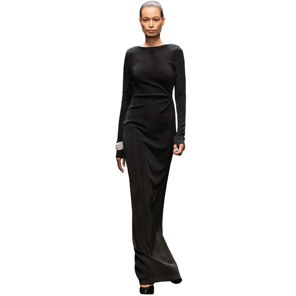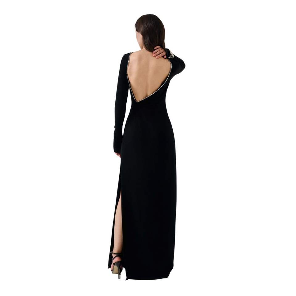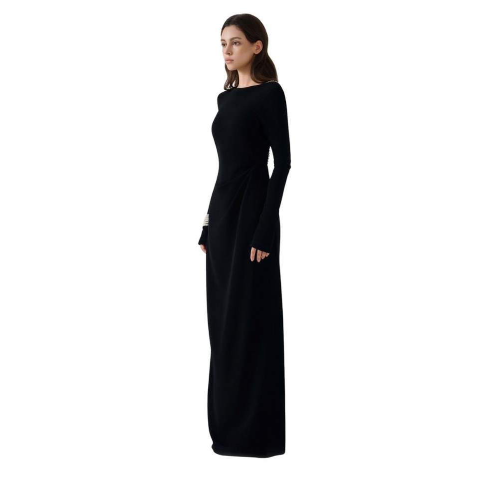 เดรสสีดำของผู้หญิงชุดเดรสยาวหรูหราพรีเมี่ยมชุดเดรส Maxi พร้อมป้ายเปิดด้านหลังแขนยาวสั่งทำจาก VN