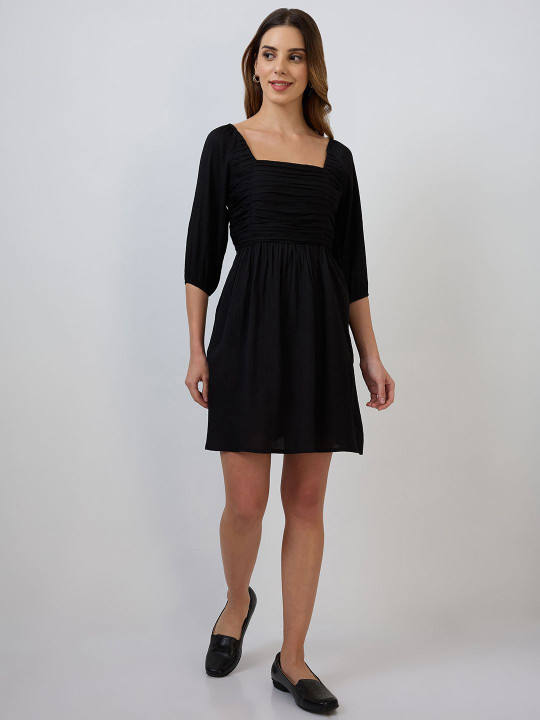 ชุดเดรสสีดำแบบเป็นมิตรต่อสิ่งแวดล้อม พิมพ์ลายทั้งตัว ทรงหลวม คอวี แขนพองสามส่วน ความยาวระดับเข่า ผ้าจอร์เจตต์ เอวธรรมชาติ สำหรับโอกาสที่เป็นทางการ