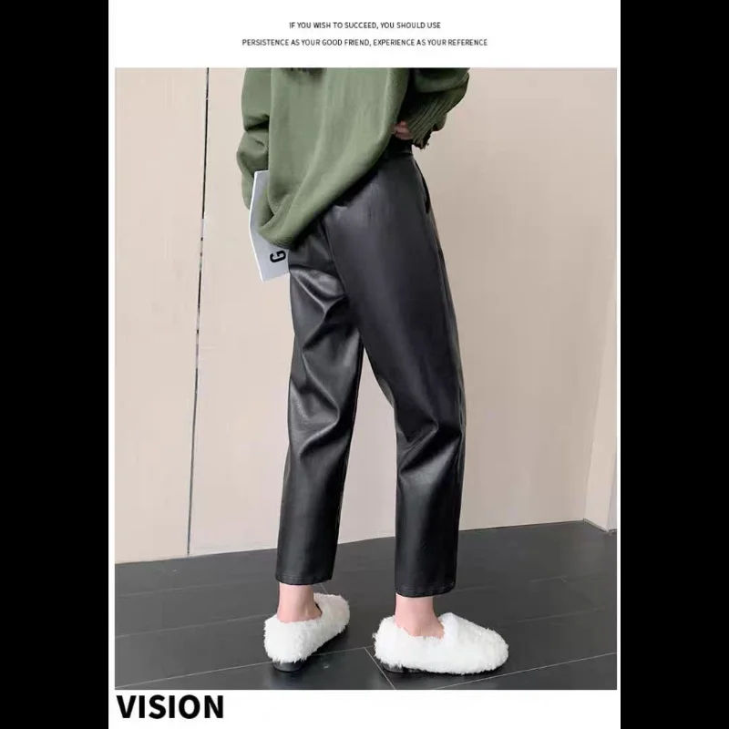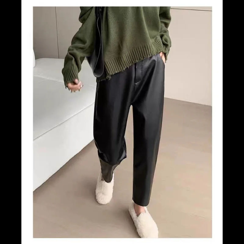 กางเกงหนัง PU สีดำยืดหยุ่นสำหรับผู้หญิง คอลเลคชั่นฤดูใบไม้ร่วง-ฤดูหนาว ปี 2025 เอวสูง ทรงขาตรงเก้าส่วน สไตล์ฮาเร็ม