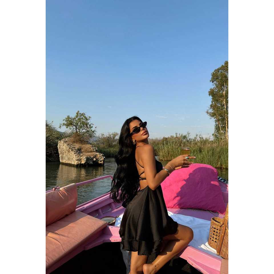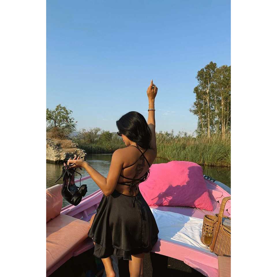 เดรสสั้นคอ halter สีดำ ทรงเอ็มไพร์ ลายดอกไม้ เรียบหรู ดูดี เหมาะสำหรับสาวออฟฟิศ ใส่ไปงานวันรับปริญญา หรืองานทางการ ไซส์ XS ผ้าบาง ซีทรู ผ่าข้าง