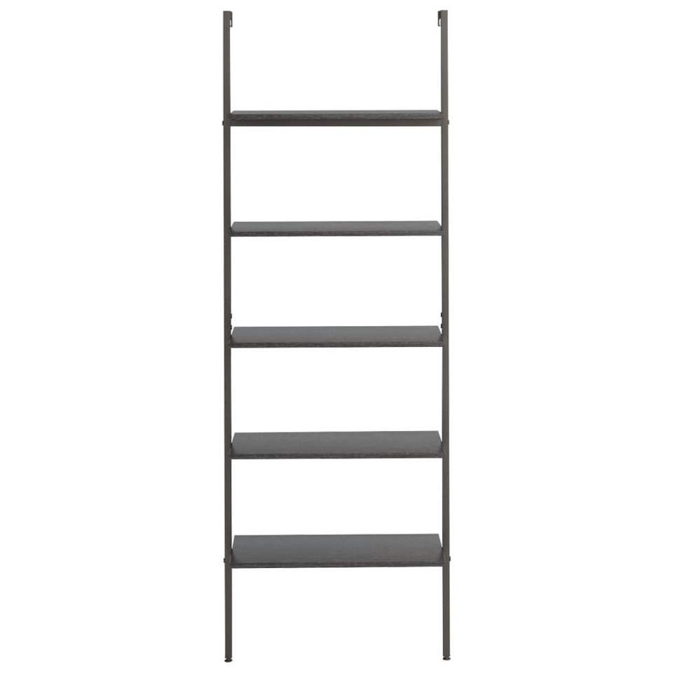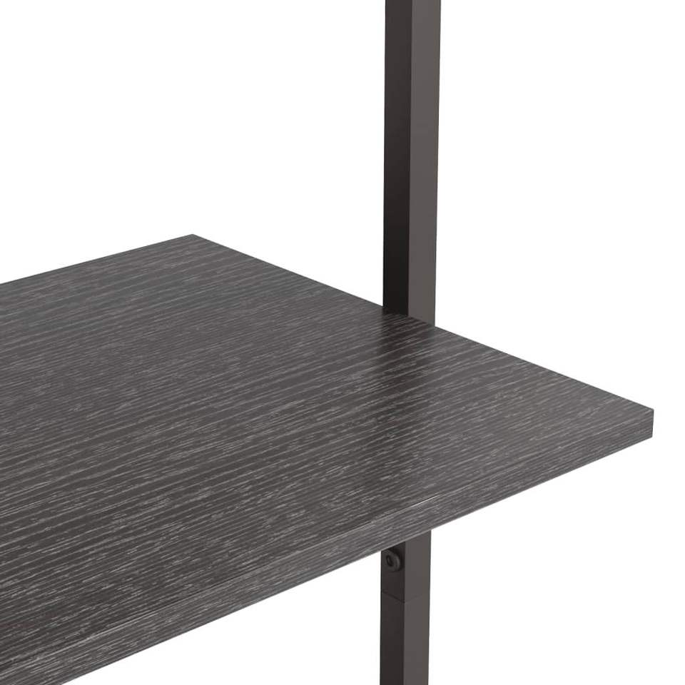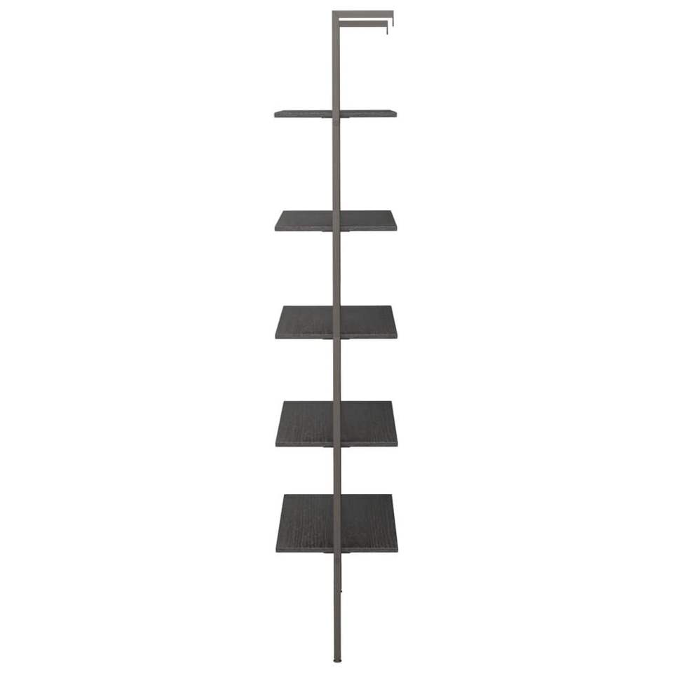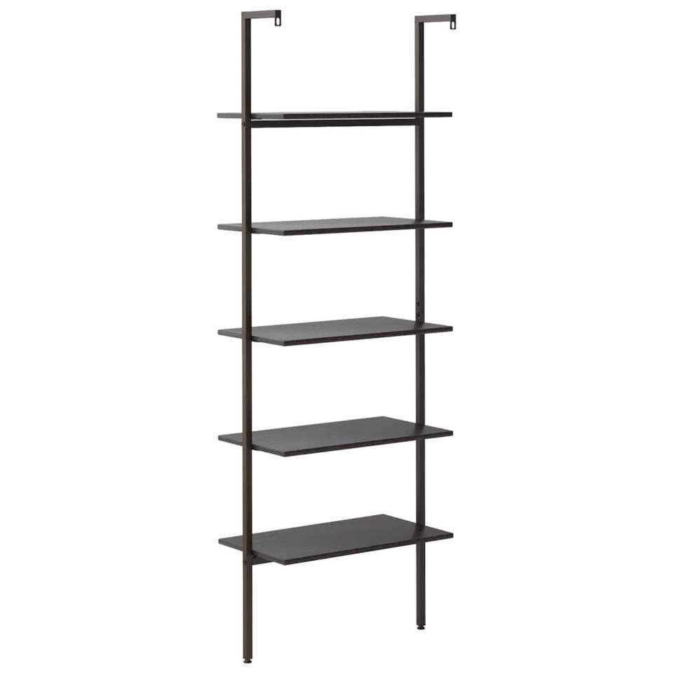 ชั้นวางของติดผนังและชั้นโชว์สินค้าทรงสูงทำจากไม้เอ็นจิเนียร์สีดำและเหล็ก