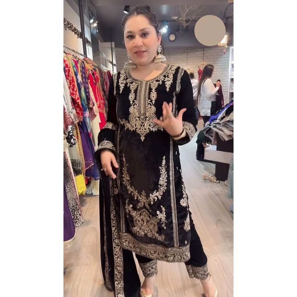 ชุดเสื้อตัวบนและล่างปักลายกำมะหยี่เส้นใยวิสคอสสีดำ