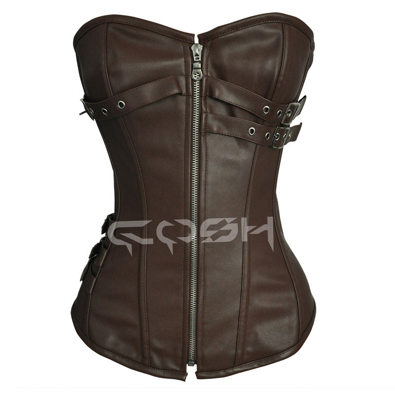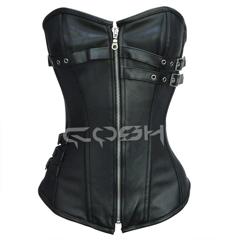 เสื้อรัดตัวหนังเทียมสีดำ | เสื้อครอปทรงบัสติเยร์แบบมีซิปด้านหน้าพร้อมสายรัดแบบหัวเข็มขัด