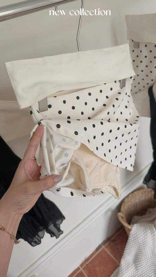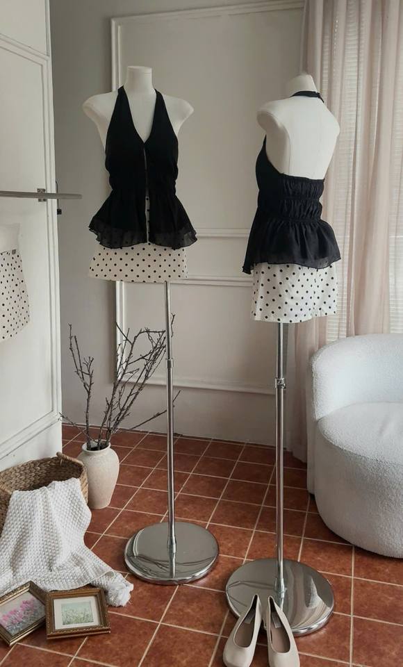 ชุดเสื้อสายเดี่ยวสีดำทรงบาน พร้อมกระโปรงลายจุด จากตัวอย่างสินค้าที่มีจำหน่าย สไตล์หวาน ลายดอกไม้ ไม่มีแขน