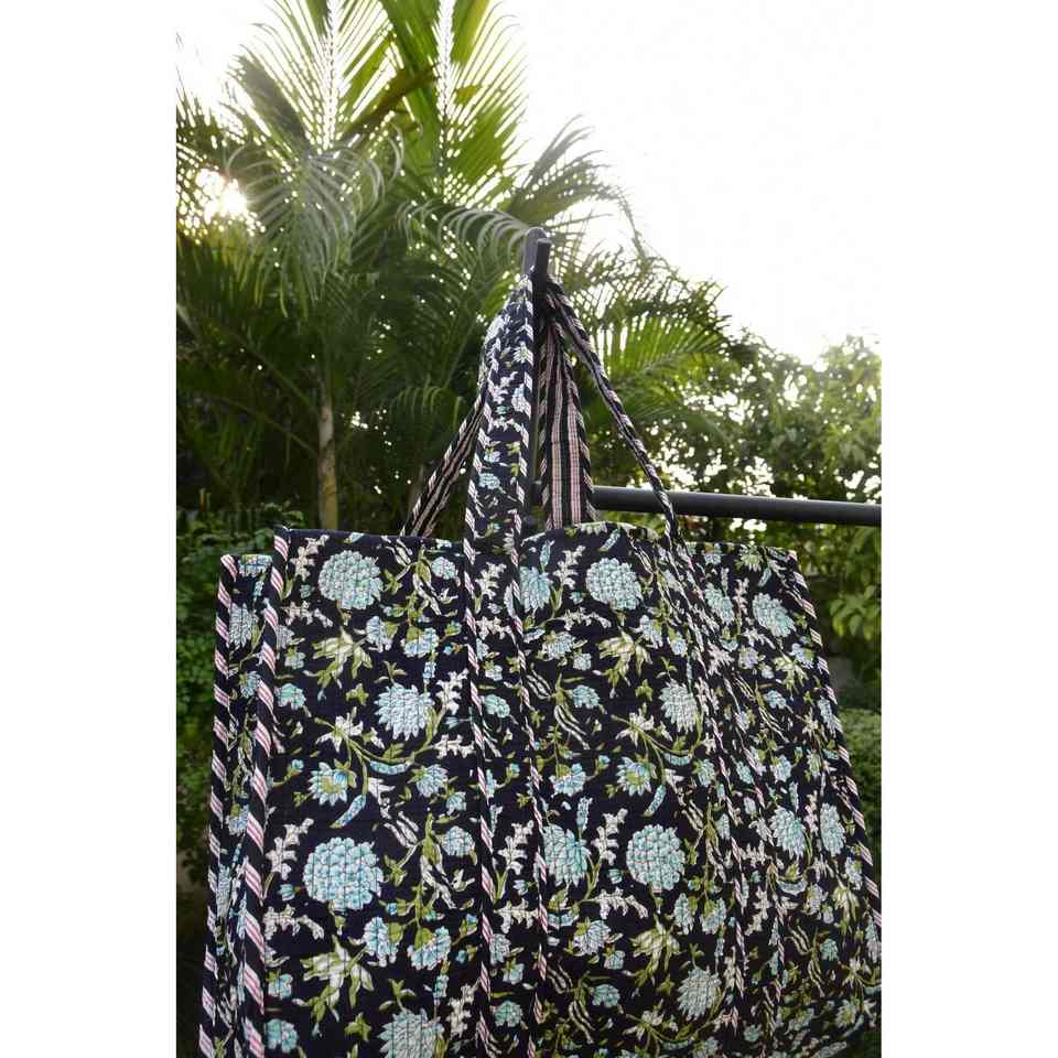 กระเป๋าโท้ทโบฮีเมียนลายดอกไม้แบบกลับด้านได้ Bohamin SustainableBlack Handblock ผ้าฝ้ายคุณภาพพรีเมียม กระเป๋าหลายช่อง เหมาะสำหรับการช้อปปิ้ง