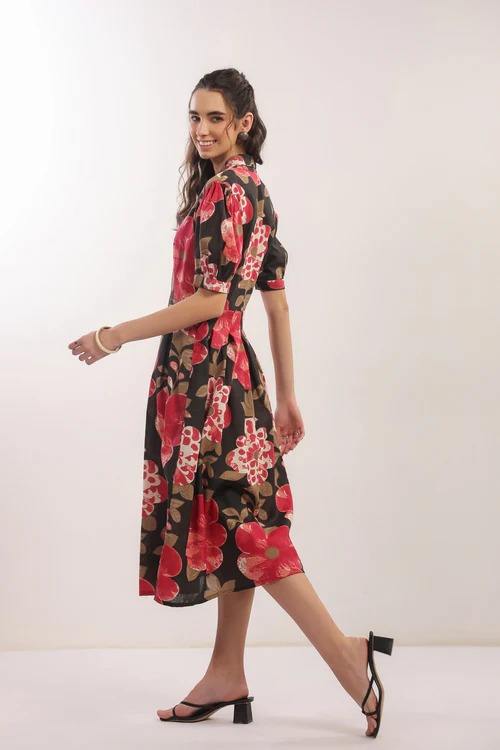 ชุดเดรสมิดิลายดอกไม้สีดำสำหรับผู้หญิงผ้าคอตตอนเนื้อนุ่มระบายอากาศได้ดีมีลายพิมพ์สีสดใสสำหรับสวมใส่ในฤดูร้อน