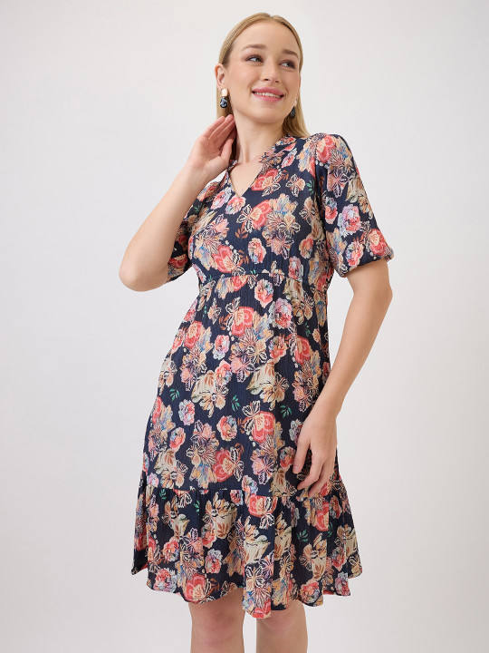 เดรสทรงเข้ารูปพิมพ์ลายดอกไม้สีดำ คอวี แขนสั้น ความยาวปานกลาง ชายกระโปรงระบาย เอวธรรมชาติ ผลิตจากผ้าจอร์เจตที่เป็นมิตรต่อสิ่งแวดล้อม