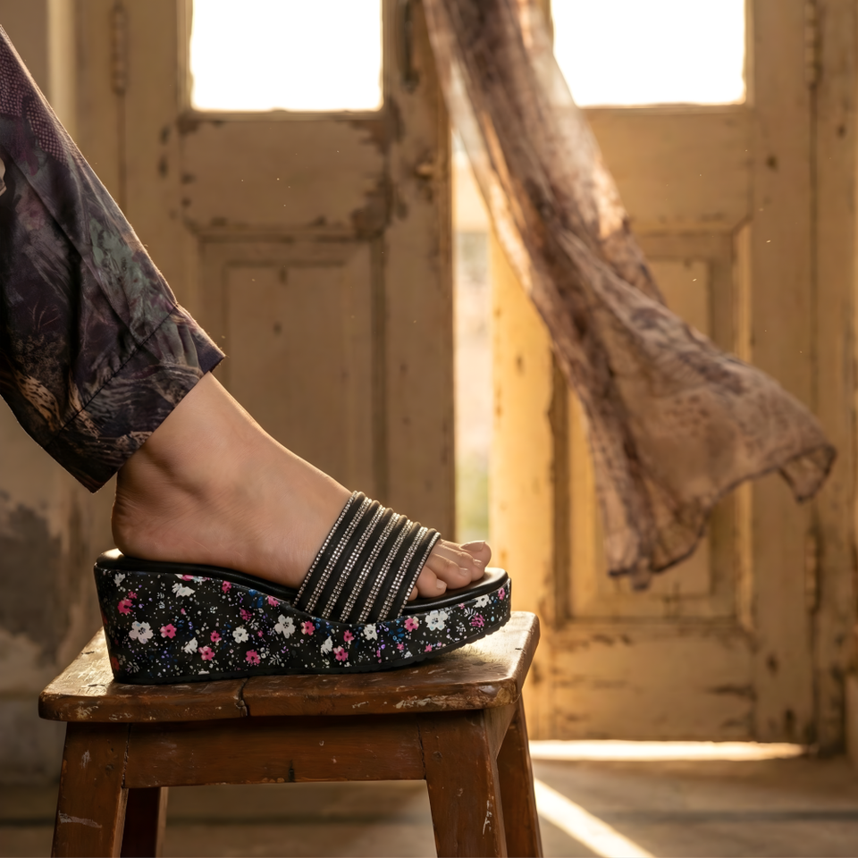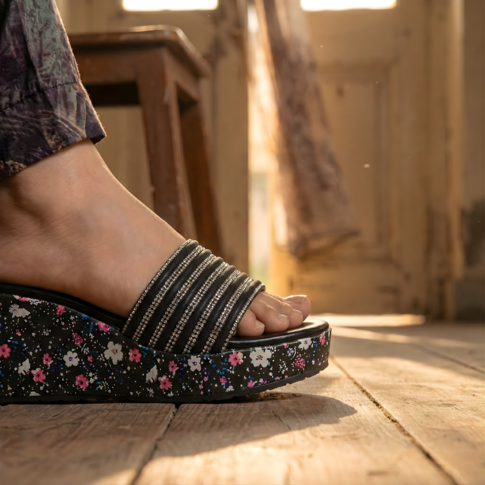 Product Name:BLACK FLORAL WEDGES 714 BK