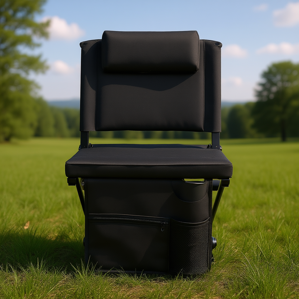 เก้าอี้สนามพับได้สีดำ พร้อมเบาะรองหลัง ที่วางแก้ว และช่องเก็บของด้านข้าง สำหรับใช้งานกลางแจ้งในสวน
