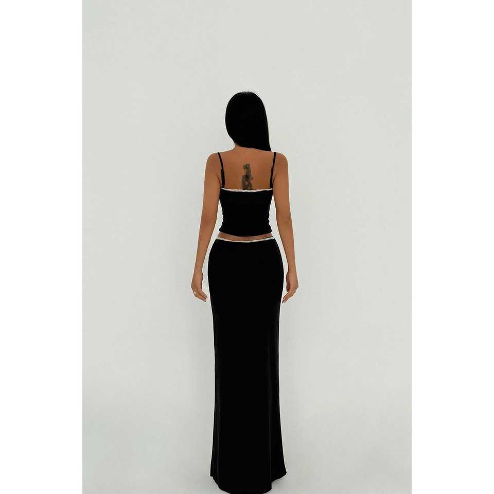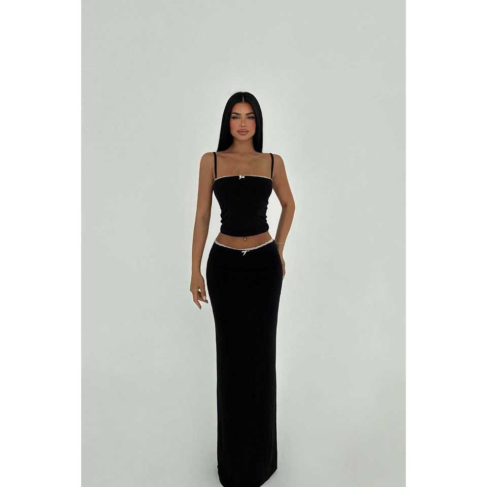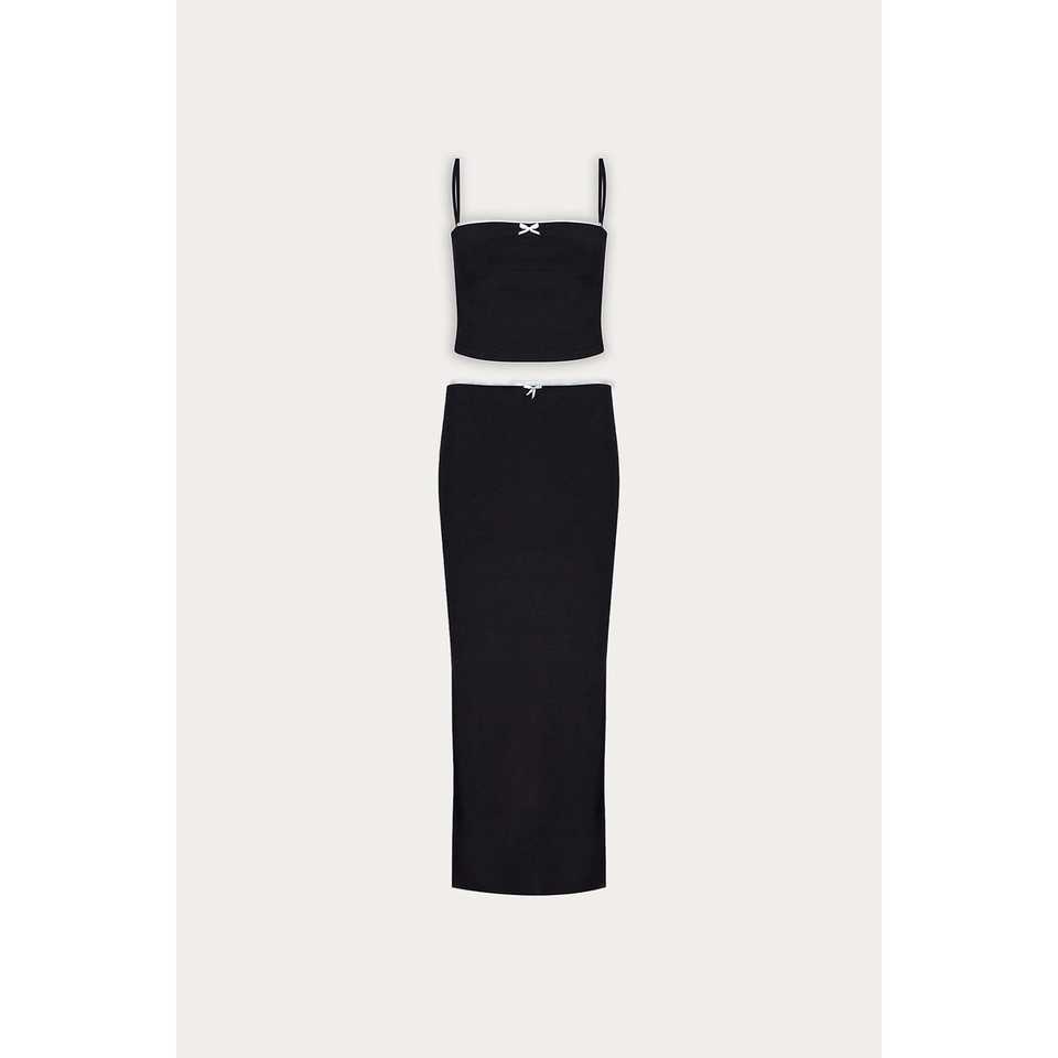ชุดสูทสีดำแบบทางการพร้อมกระโปรงตกแต่งกระดุม