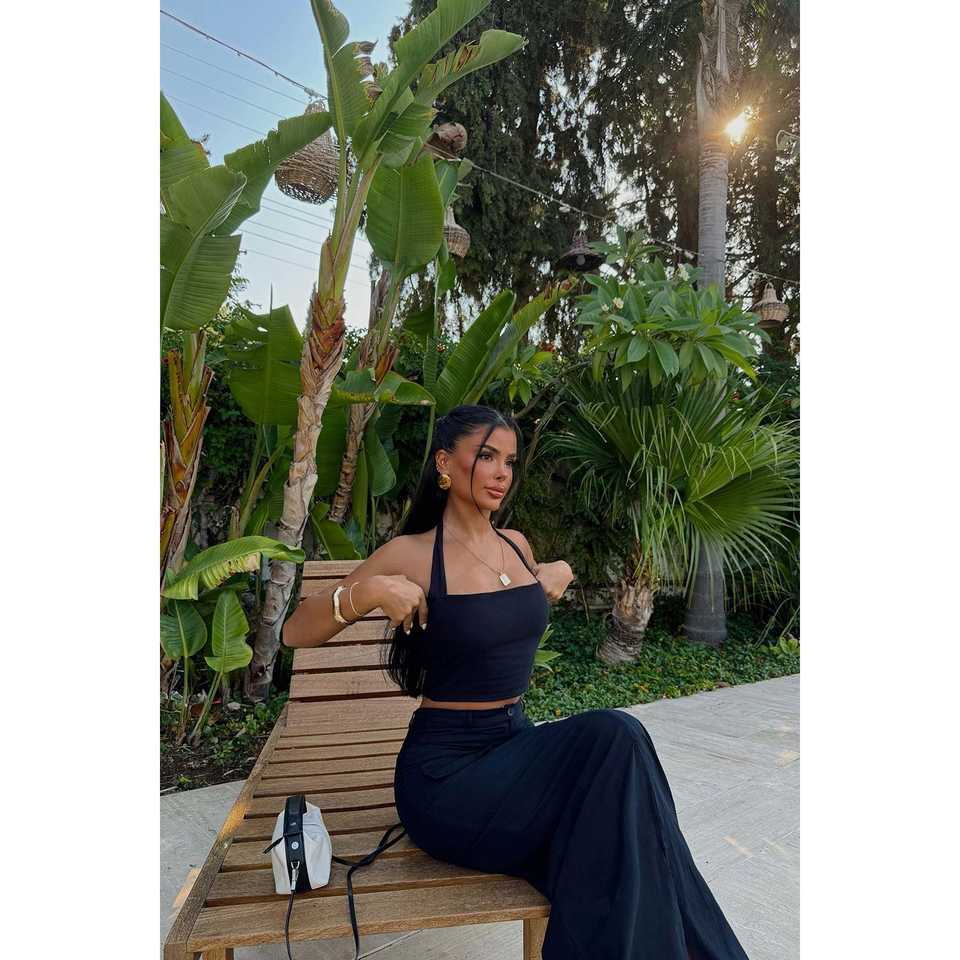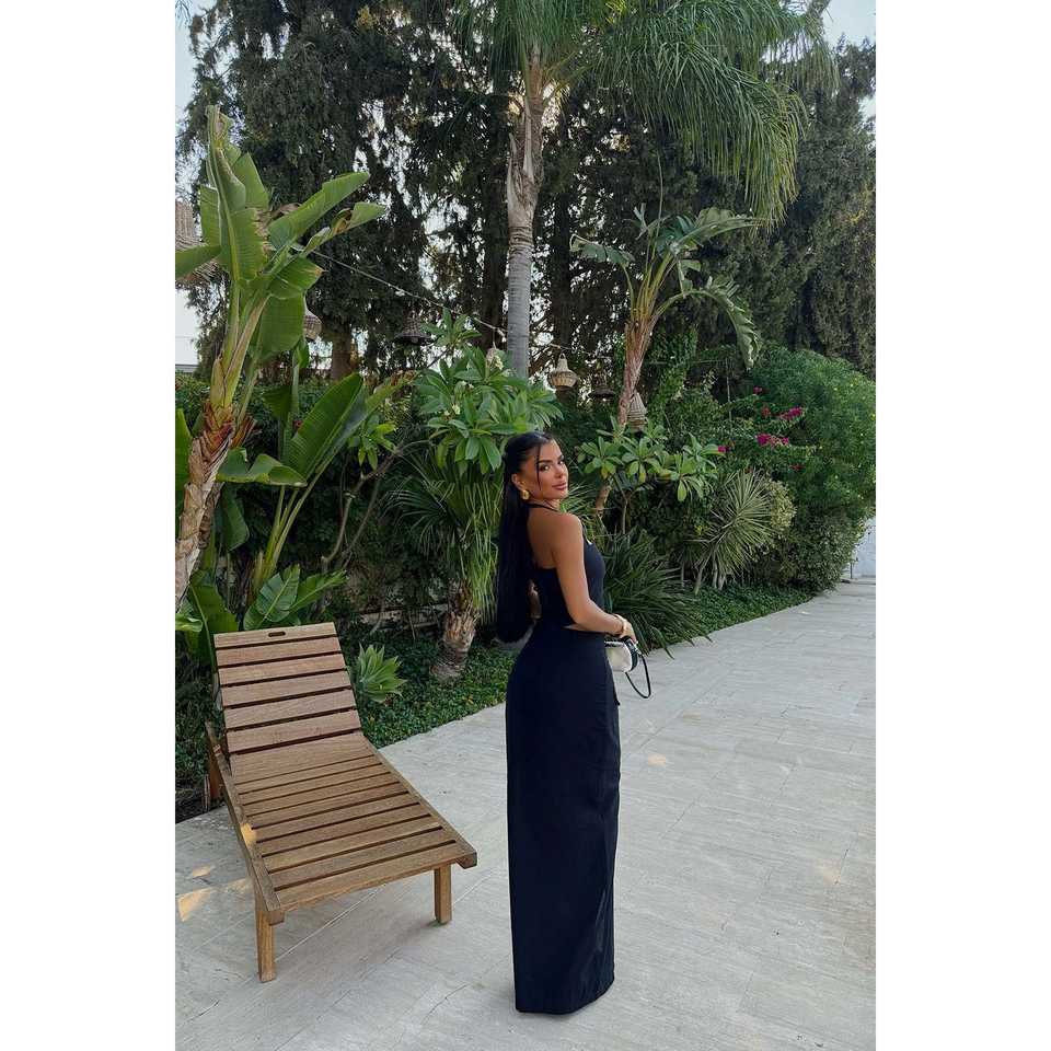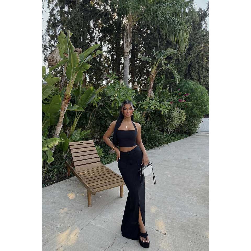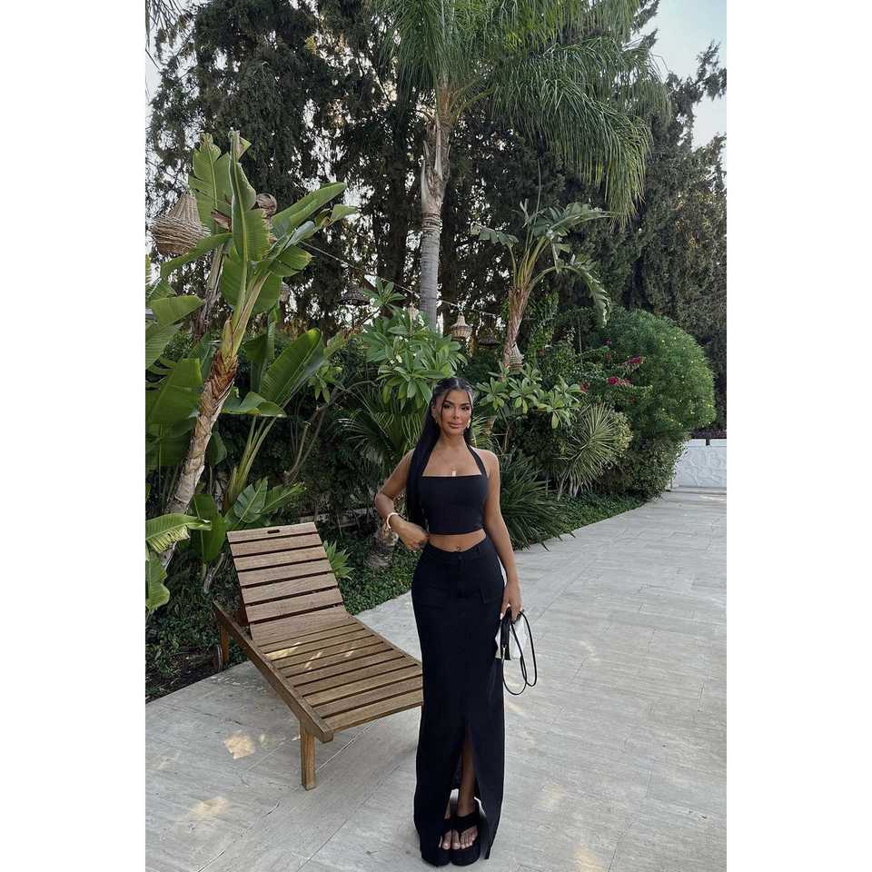 ชุดสูทสีดำแบบเป็นทางการพร้อมกระโปรงตกแต่งกระดุม