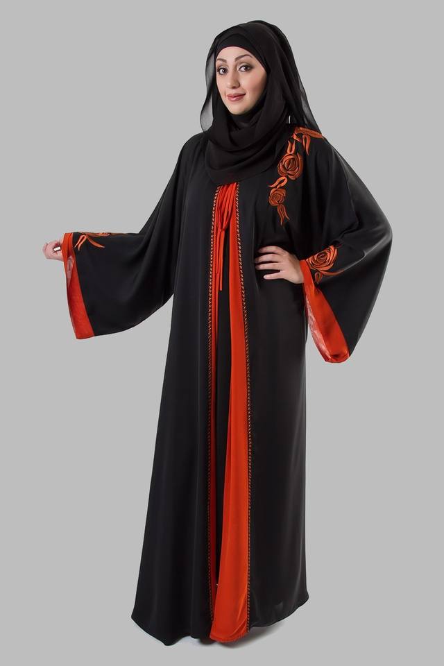 อบายะห์แบบเปิดด้านหน้าสีดำพร้อมงานปักดอกไม้สีแดงเป็นที่ต้องการสูงในดูไบ
