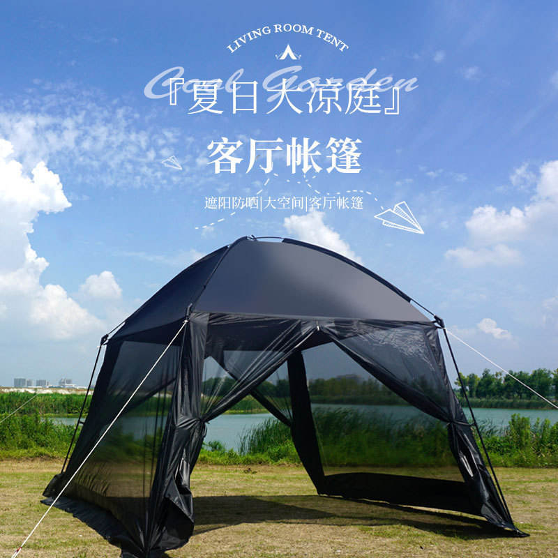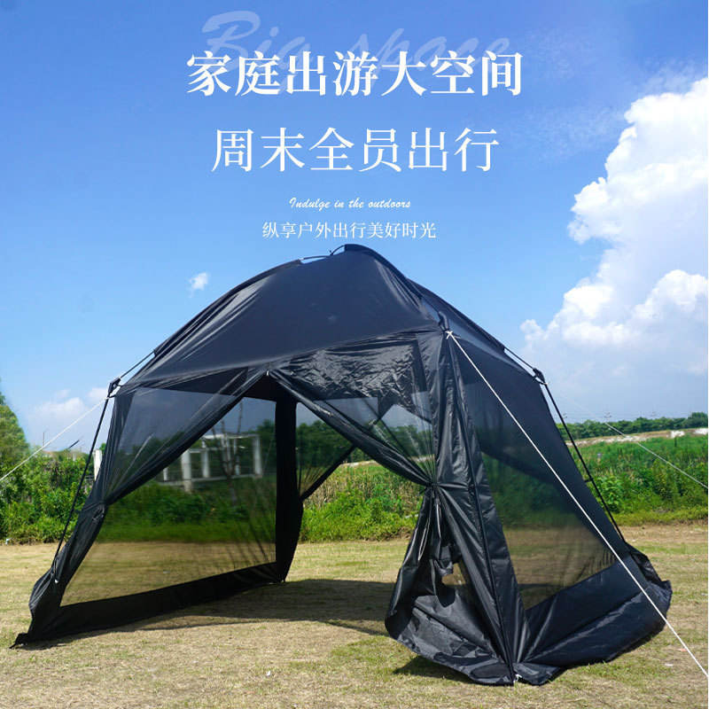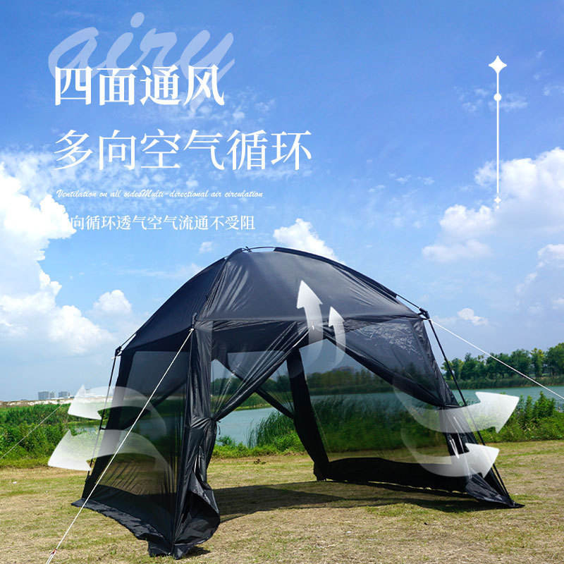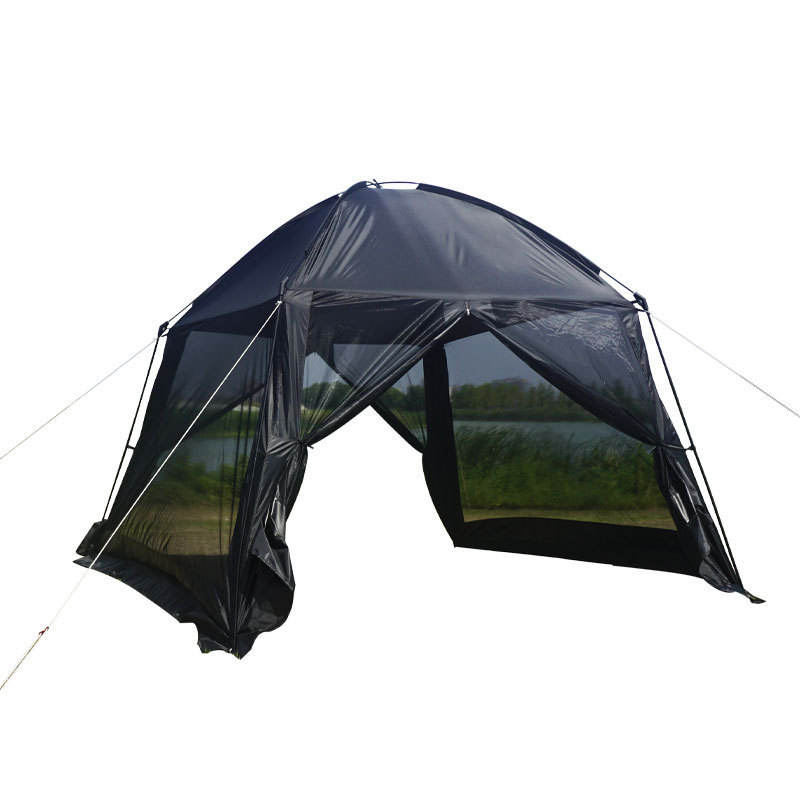 เต็นท์บังแดดตาข่ายสีดำแบบเต็มรูปแบบสำหรับหลายคน ใช้สำหรับตั้งแคมป์กลางแจ้งหรือเป็นที่พักพิงในลานบ้าน