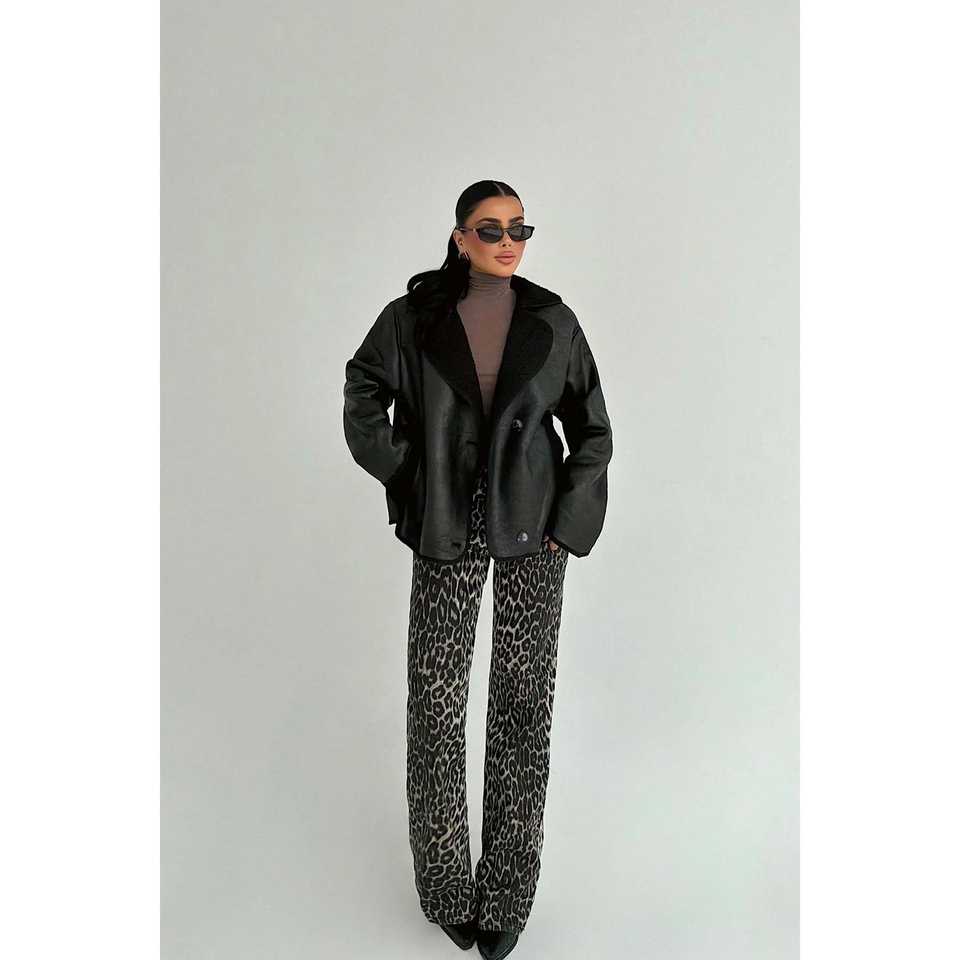 เสื้อแจ็คเก็ตแต่งขนสีดำพร้อมลายพิมพ์ ซิปปิด และตกแต่งด้วยขนนกแบบทอ