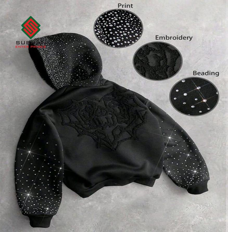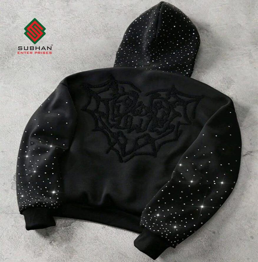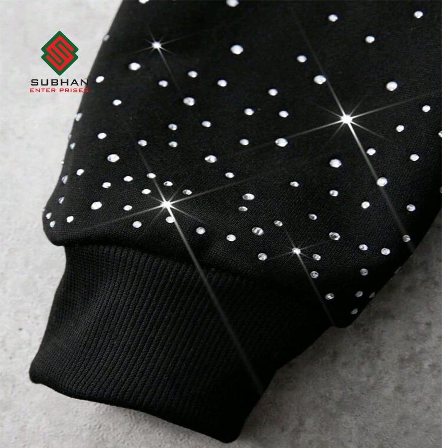เสื้อฮู้ดถักไหมพรมฤดูหนาวผ้าฝ้าย 100% ระบายอากาศได้ดี แรงบันดาลใจจากกาแล็กซี่สีดำ พร้อมรายละเอียดประดับคริสตัลและงานปักลายนูน