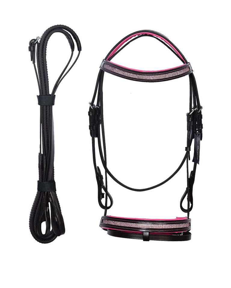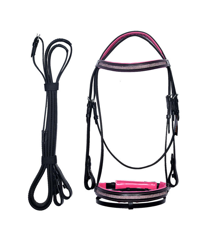 บังเหียนม้าหนังแท้สีดำ สายรัดหน้าผากและสายรัดจมูกบุฟองน้ำสีชมพู สายบังเหียนเข้าชุด ปรับได้ สำหรับขี่ม้าแบบอังกฤษ ทำจากสแตนเลส