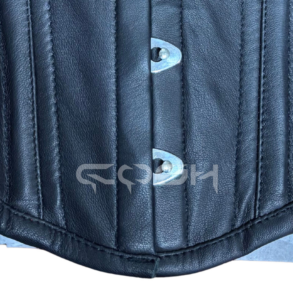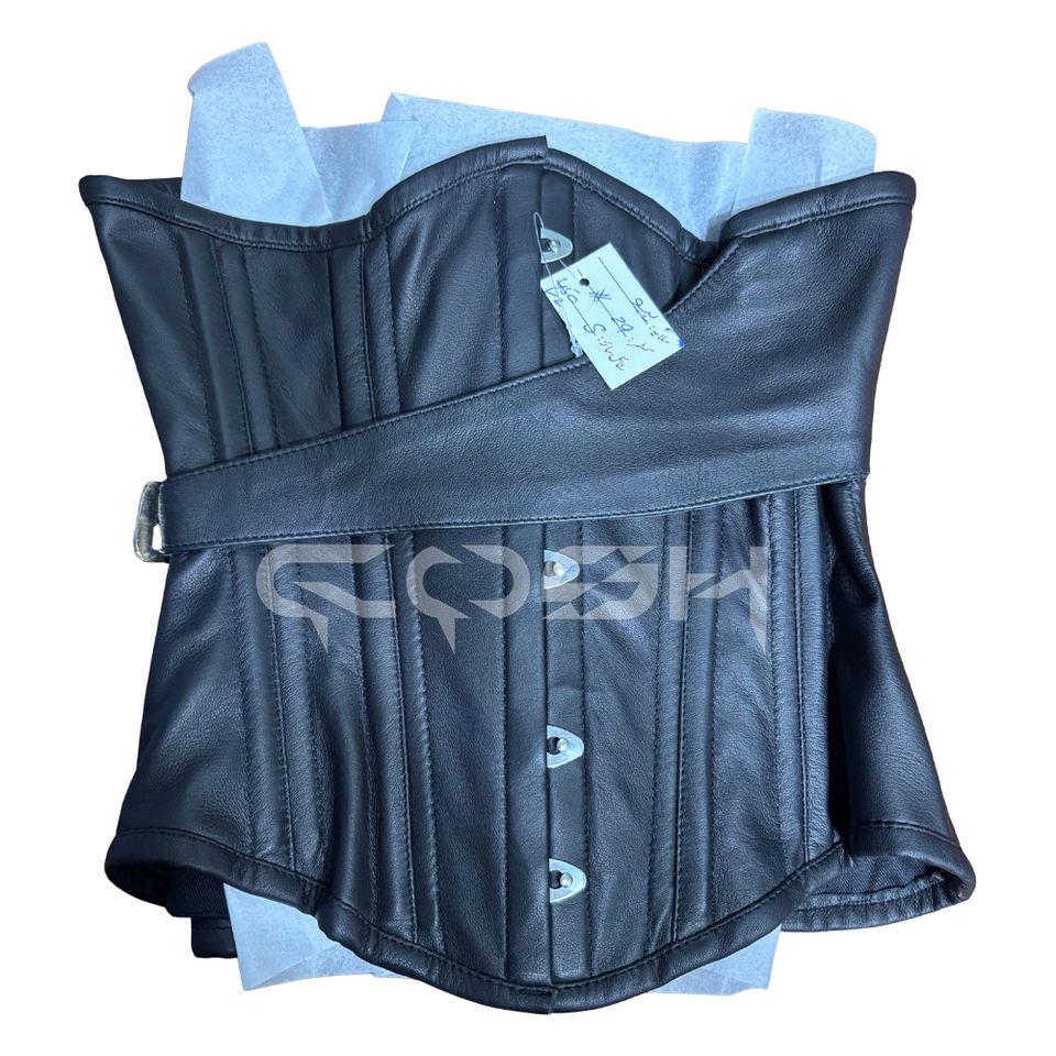 คอร์เซ็ทหนังแท้สีดำแบบรัดใต้อก พร้อมโครงเหล็กคู่และดีไซน์เข็มขัดกว้าง กระชับสัดส่วนได้ดีเยี่ยม