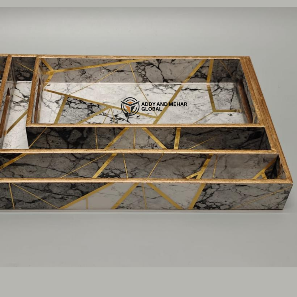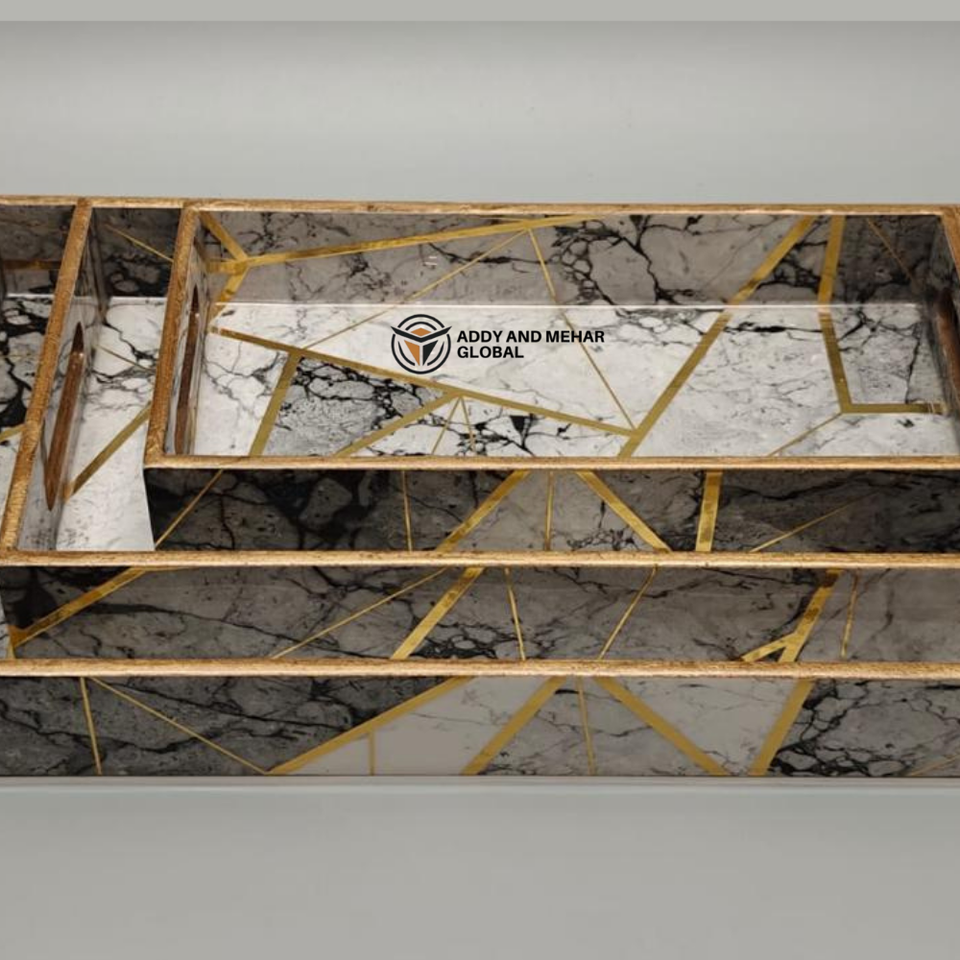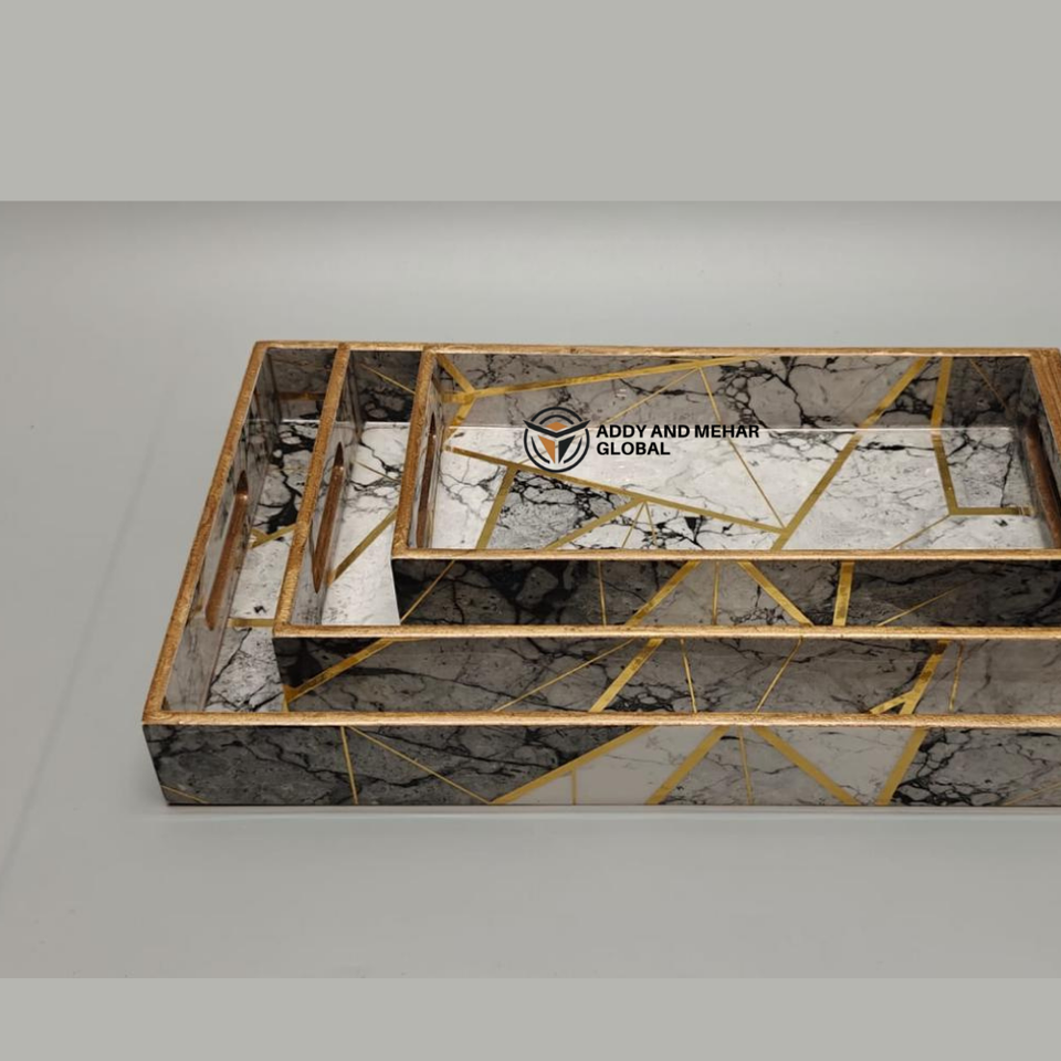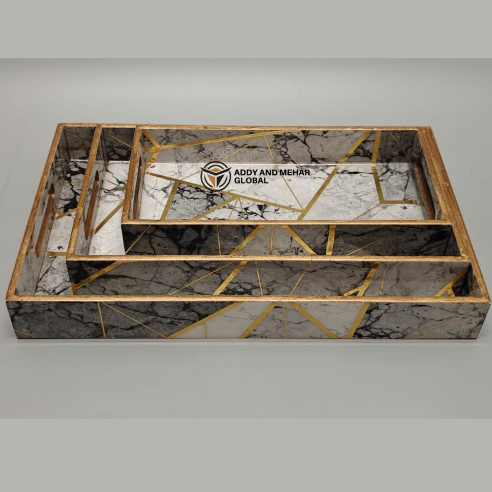 ชุดถาดเสิร์ฟเคลือบสีดำลายเรขาคณิต 3 ชิ้น – ถาดซ้อนกันได้ทำจาก MDF และกระดาษ ปลอดภัยสำหรับอาหาร ดีไซน์ทันสมัยหรูหรา สำหรับห้องครัว ห้องรับประทานอาหาร และตกแต่งบ้าน
