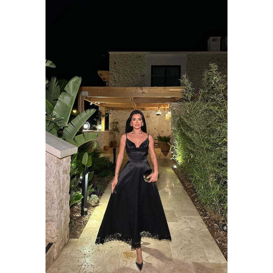ชุดราตรีผ้าซาตินสีดำทรงบอลกาวน์ แต่งขอบลูกไม้ เหมาะสำหรับงานเลี้ยงกลางคืนและงานเลี้ยงรับรอง