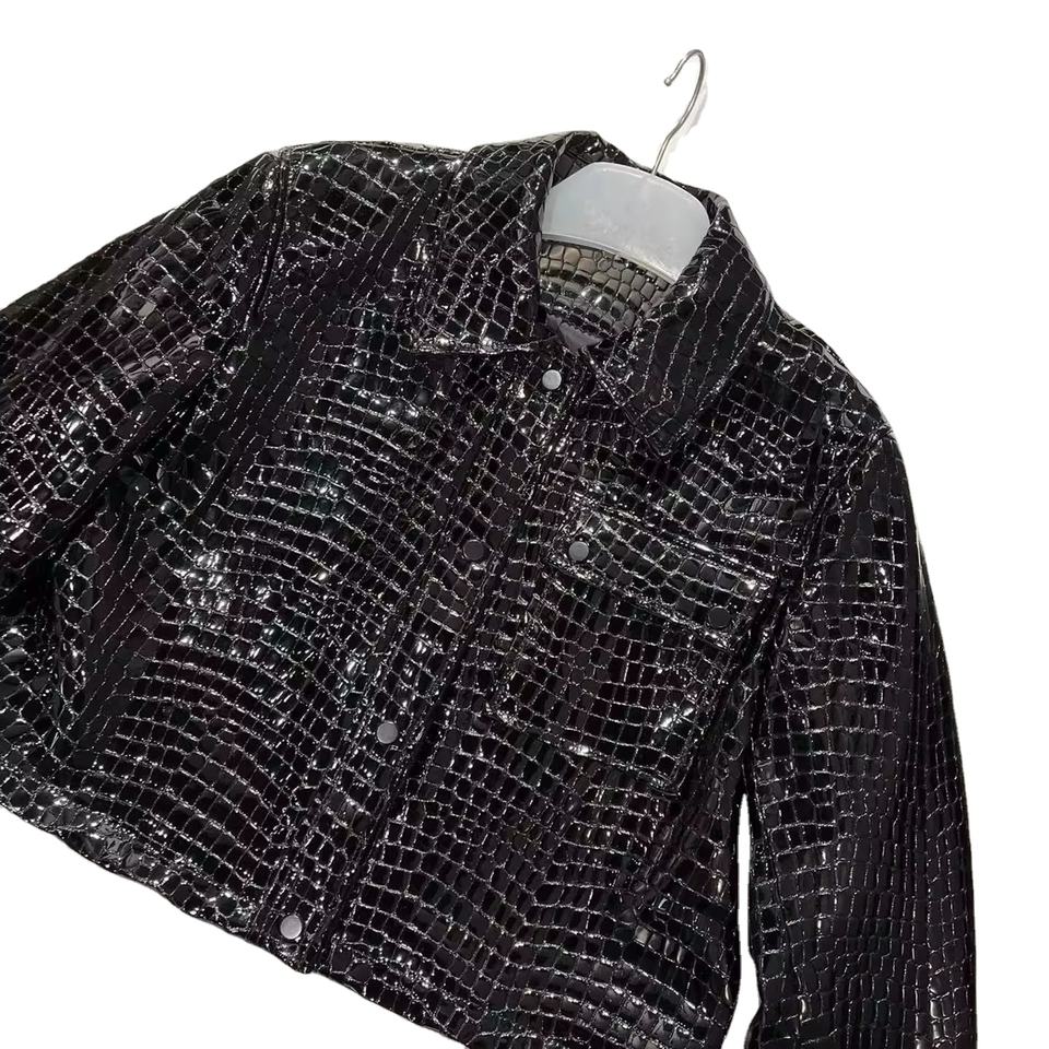 แจ็คเก็ตหนังวัวแท้สีดำเงา ลายหนังจระเข้ ซิปหน้า คอปกกลม ทรงบอมเบอร์ หนังแท้เนื้อสัมผัสพิเศษ สำหรับผู้หญิง ฤดูหนาว