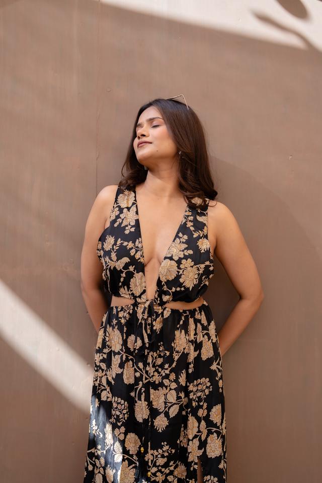 เดรสสีดำลายดอกไม้แบบเว้าช่วงเอว ความยาวปานกลาง คอวีลึก ซักได้ เหมาะสำหรับงานเลี้ยงตอนเย็นในฤดูร้อน