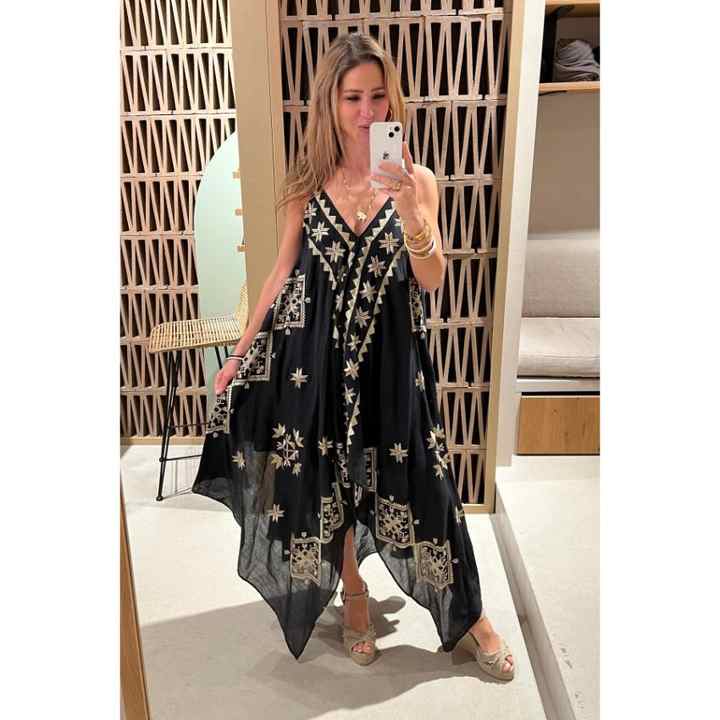 ชุดเดรสคาฟทันพิมพ์ลายสีดำทองสไตล์โบฮีเมียนสำหรับผู้หญิง ผ้าฝ้าย 100% คอวี แขนพอง ทรงหลวม เหมาะสำหรับใส่ไปเที่ยวชายหาดหรือรีสอร์ท เป็นมิตรต่อสิ่งแวดล้อม