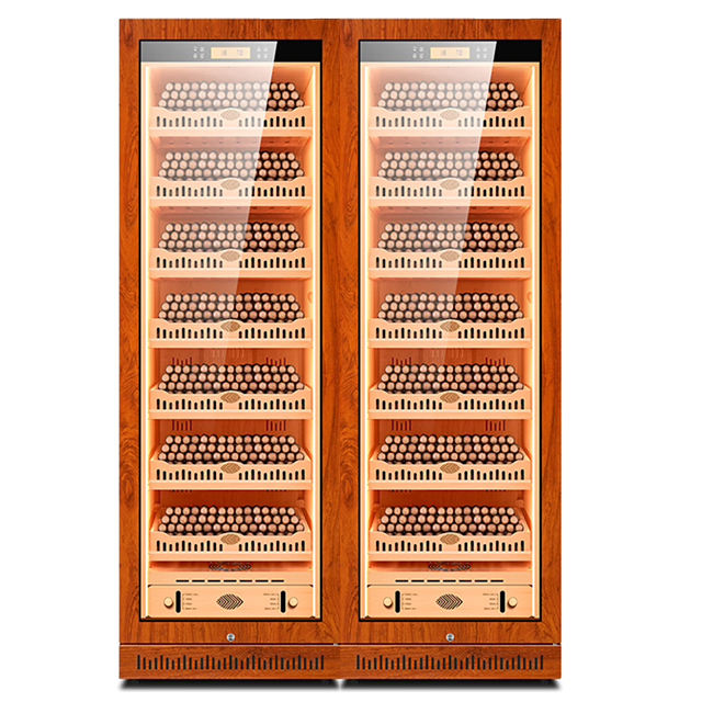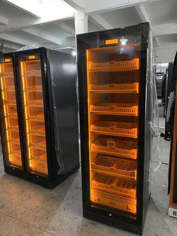 ตู้เก็บซิการ์แบบสองโซน ใช้แก๊ส ประหยัดพลังงาน ทำจากไม้ซีดาร์สเปนสีดำทอง พร้อมประตูกระจกกันฝ้าอัตโนมัติ และวัสดุสแตนเลส