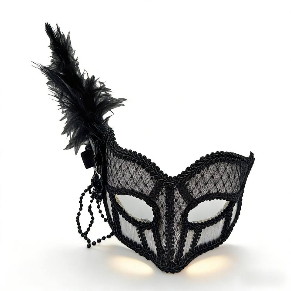 ผ้าปิดหน้าสไตล์โกธิคสีดำพร้อมลูกไม้และหน้ากากตาแบบขนนก