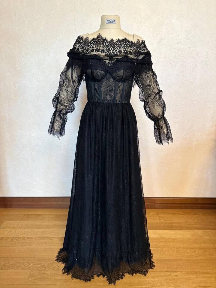 เดรสงานพรอมงานแต่งงานแบบกอธิคสีดำชุดเดรสงานเลี้ยงราตรีกระโปรงยาวลูกไม้ชุดเดรสปาร์ตี้หรูหรา
