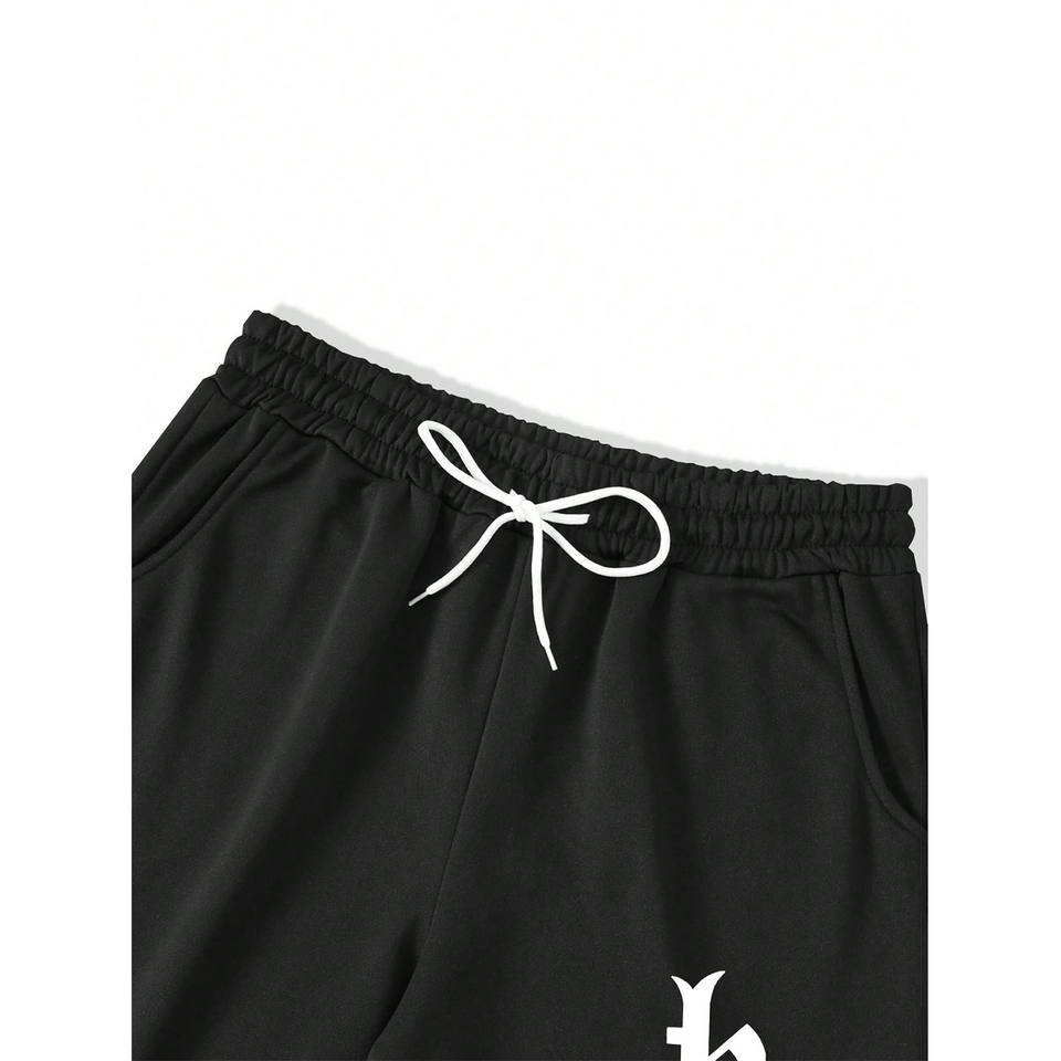 ชุดวิ่งมีฮู้ดกราฟิกสีดำและขากว้างสำหรับผู้ชายเครื่องแต่งกายแนวสตรีทผ้าฟลีซสองชิ้นพร้อมรายละเอียดเสื้อผ้าลำลองพิมพ์ลาย