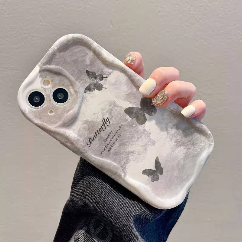 เคสโทรศัพท์มือถือ TPU ซิลิโคนขอบคลื่นพิมพ์ลายผีเสื้อสีดำเทาดำสำหรับ iPhone 8 x XR XS 11 12 13 14 15 16 17 PRO MAX