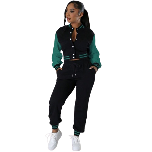 ชุดวอร์มสองชิ้นสำหรับผู้หญิงเสื้อแจ็กเก็ตแฟชั่นสไตล์สตรีทแวร์สีเขียวดำ