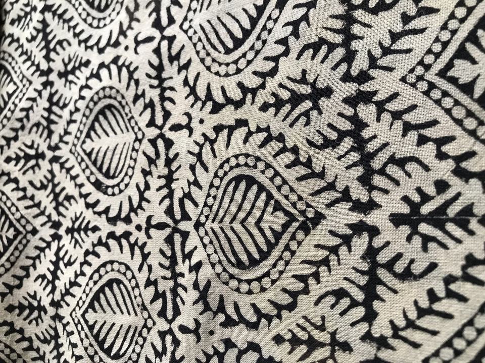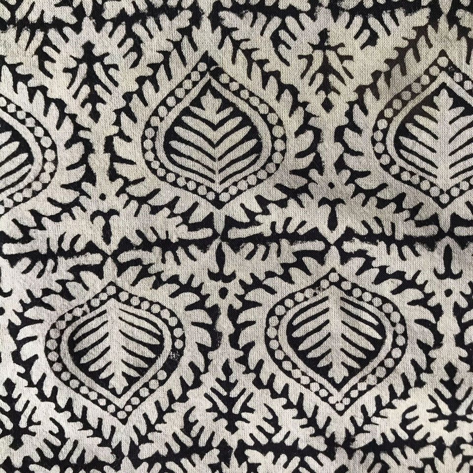 ผ้าฝ้ายพิมพ์ลายบล็อกสีดำ ลายใบไม้เรขาคณิตบนพื้นผ้าสีธรรมชาติ | ตลาดขายส่งเจียปุร์