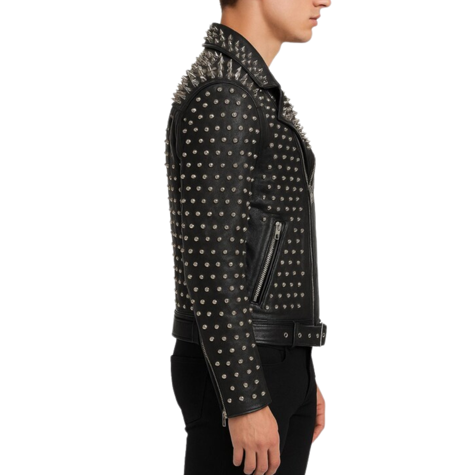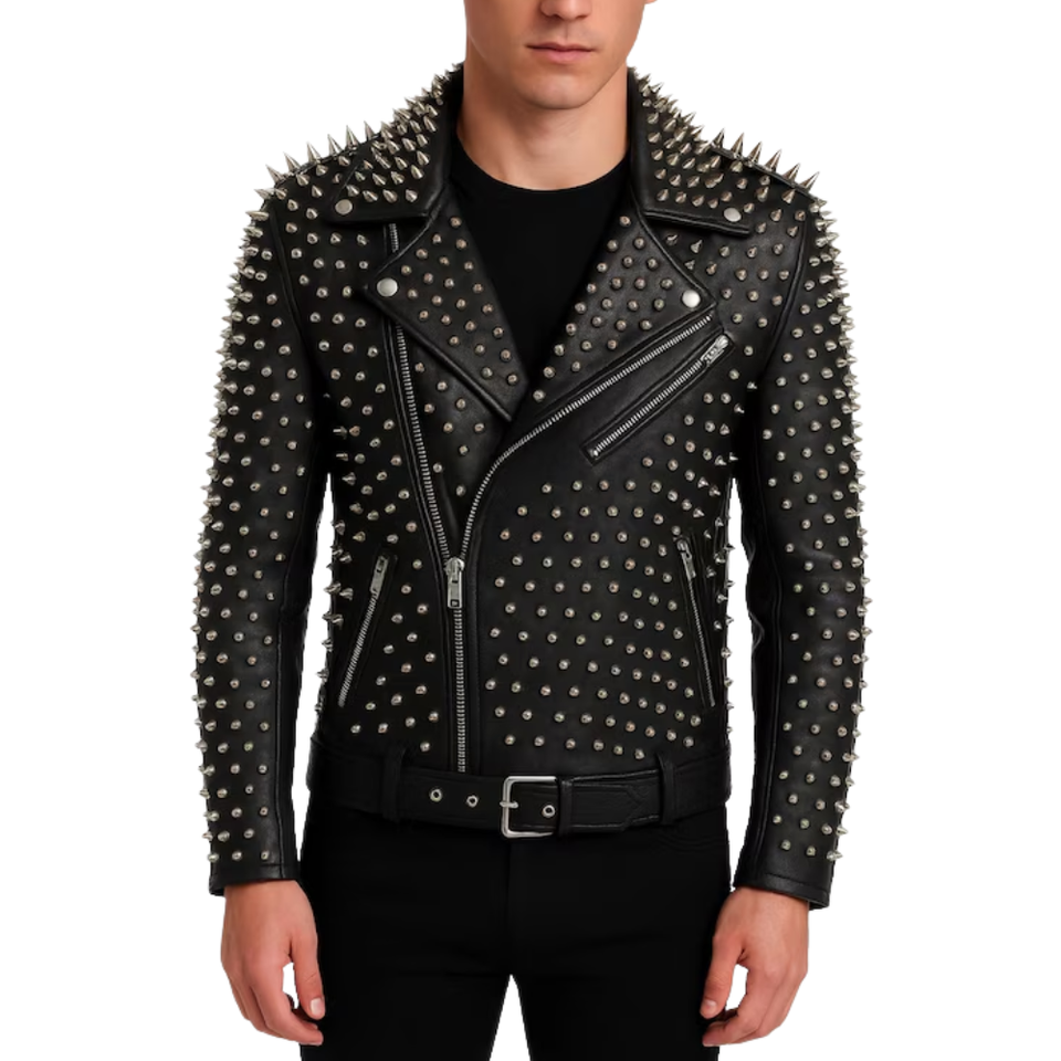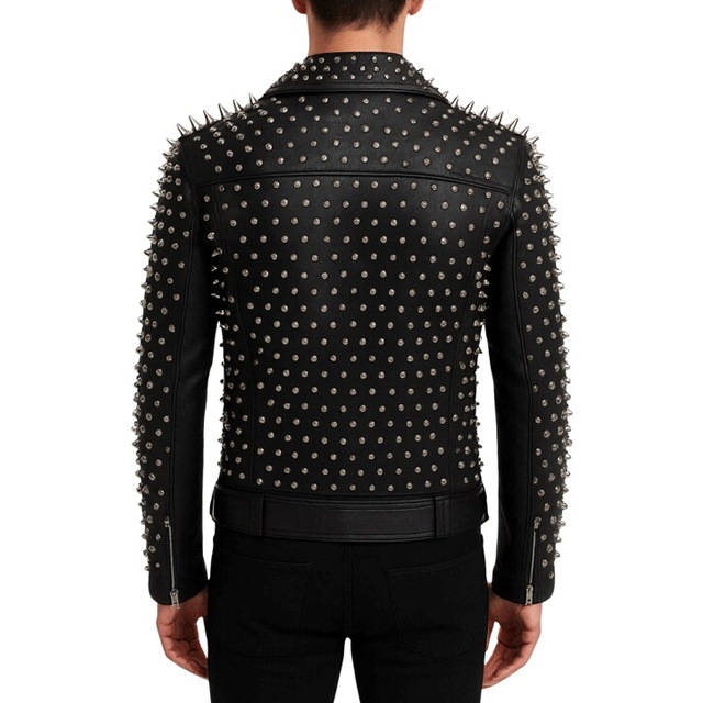 แจ็กเก็ตหนังวัวสีดำทำด้วยมือสำหรับผู้ชายแจ็คเก็ตหนังแท้สไตล์นักขี่จักรยานพังค์ร็อก