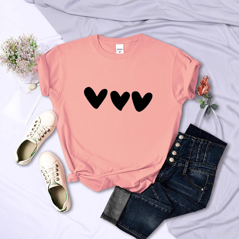 เสื้อยืดพิมพ์ลายหัวใจสีดำสำหรับผู้หญิงเสื้อยืดแขนสั้นแนวสตรีทเสื้อลำลองระบายอากาศได้ดี