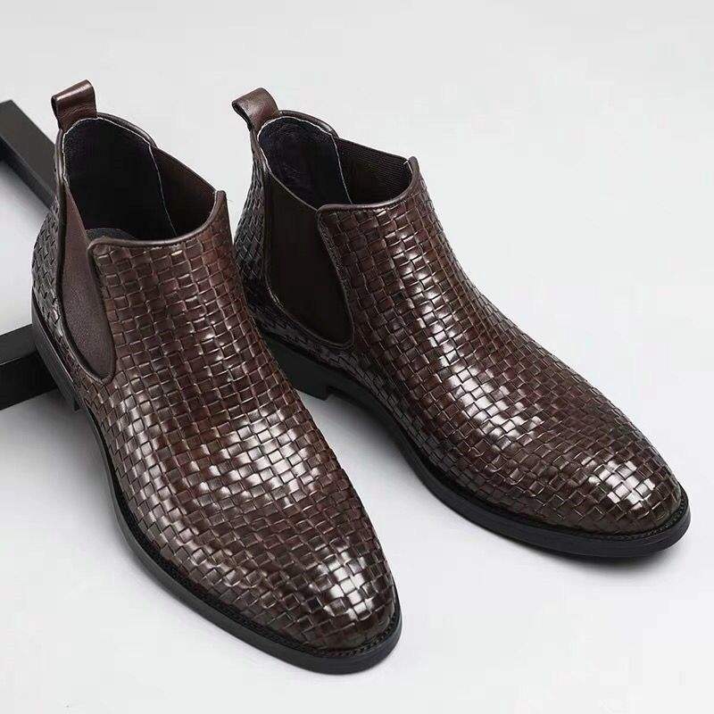 รองเท้าบูทข้อเท้าผู้ชายหนังแท้คุณภาพสูงสีดำลายทอ ดีไซน์หรูหรา กันลื่น รุ่น JiuZhou C12-9 นวดเท้าได้ทุกจุด
